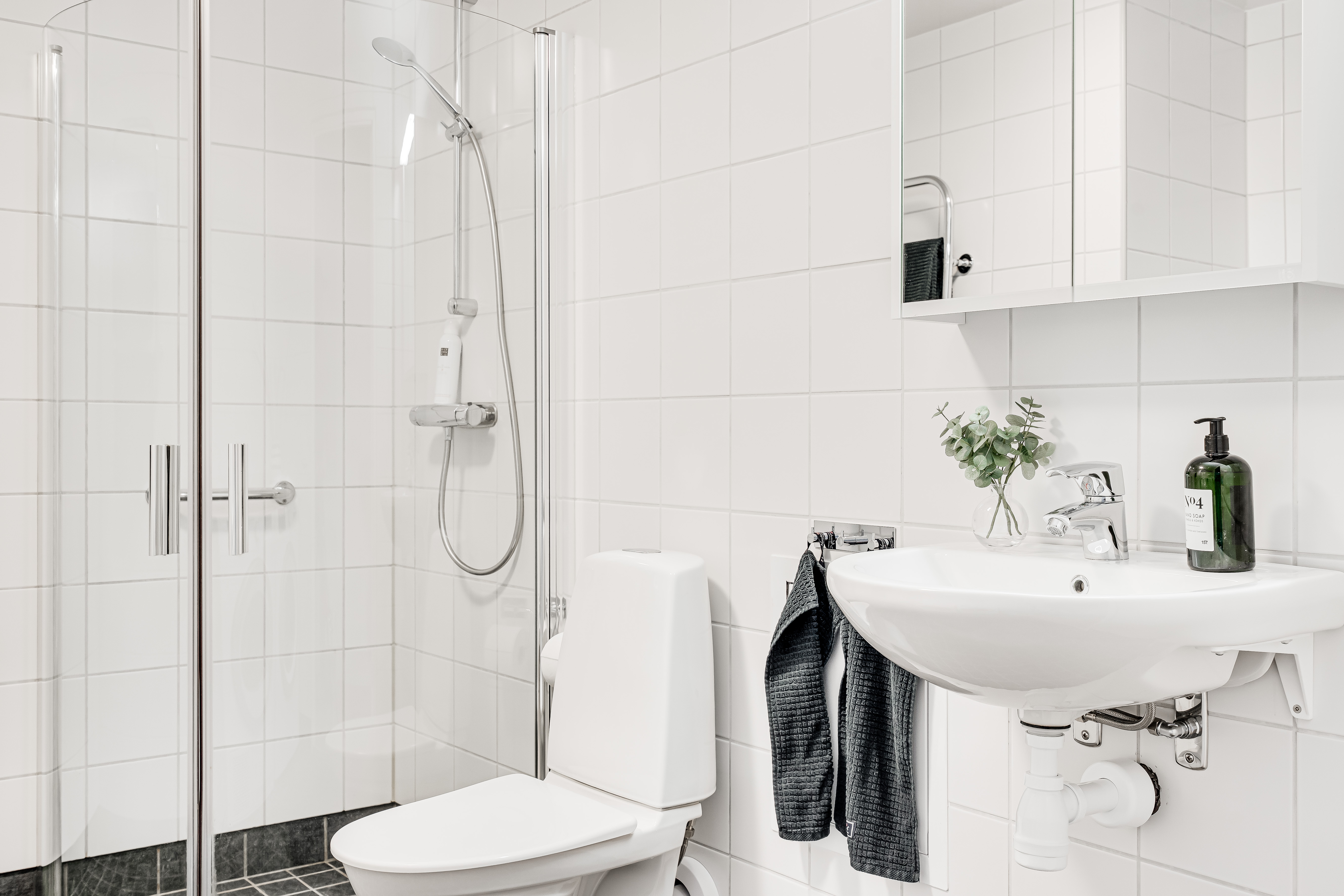 Badrummet har helkaklade väggar i vitt och grå klinker på golvet. Duschen med glasdörrar som kan vikas inåt när duschen inte används, vilket ger bättre golvyta. I badrummet finns tvättmaskin och torktumlare med överliggande bänkskiva vilket ger en bra och trevlig arbetsyta.