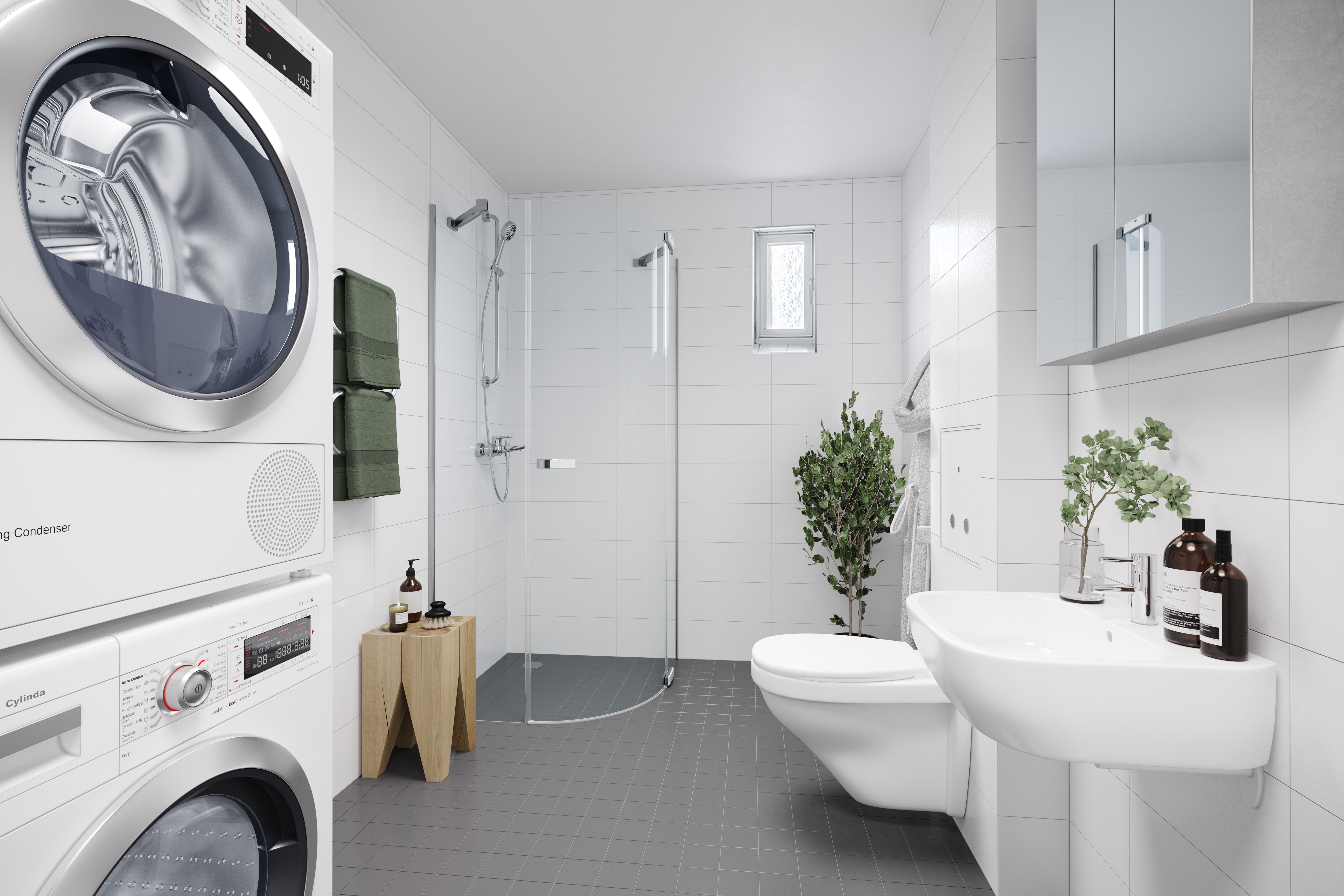 Lägenheten har en annorlunda men välplanerad planlösning. Badrummet går i stilrena kulörer vitt och grått som också är utrustat med tvättmaskin, torktumlare och dusch med glasdörrar som kan vikas inåt och ge bättre utrymme när duschen ej används. Köket är smakfullt inrett med vita luckor, modern bänkskiva, rostfria energisnåla vitvaror. God förvaring och bra med arbetsytor.