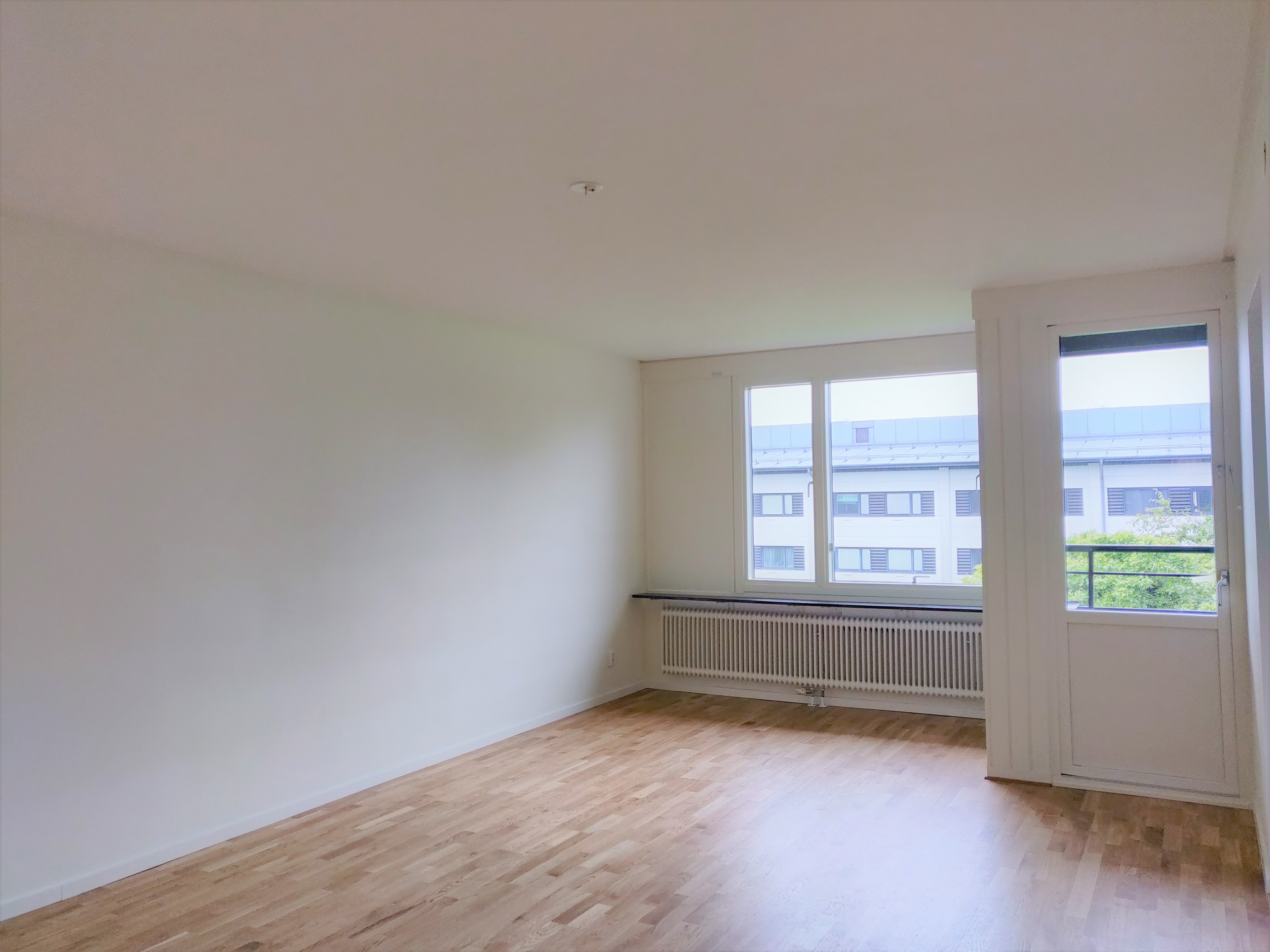 Hela lägenheten har ekparkett på golvet, alla väggar är fräscht vitmålade och fristående garderober finnas på plats.
