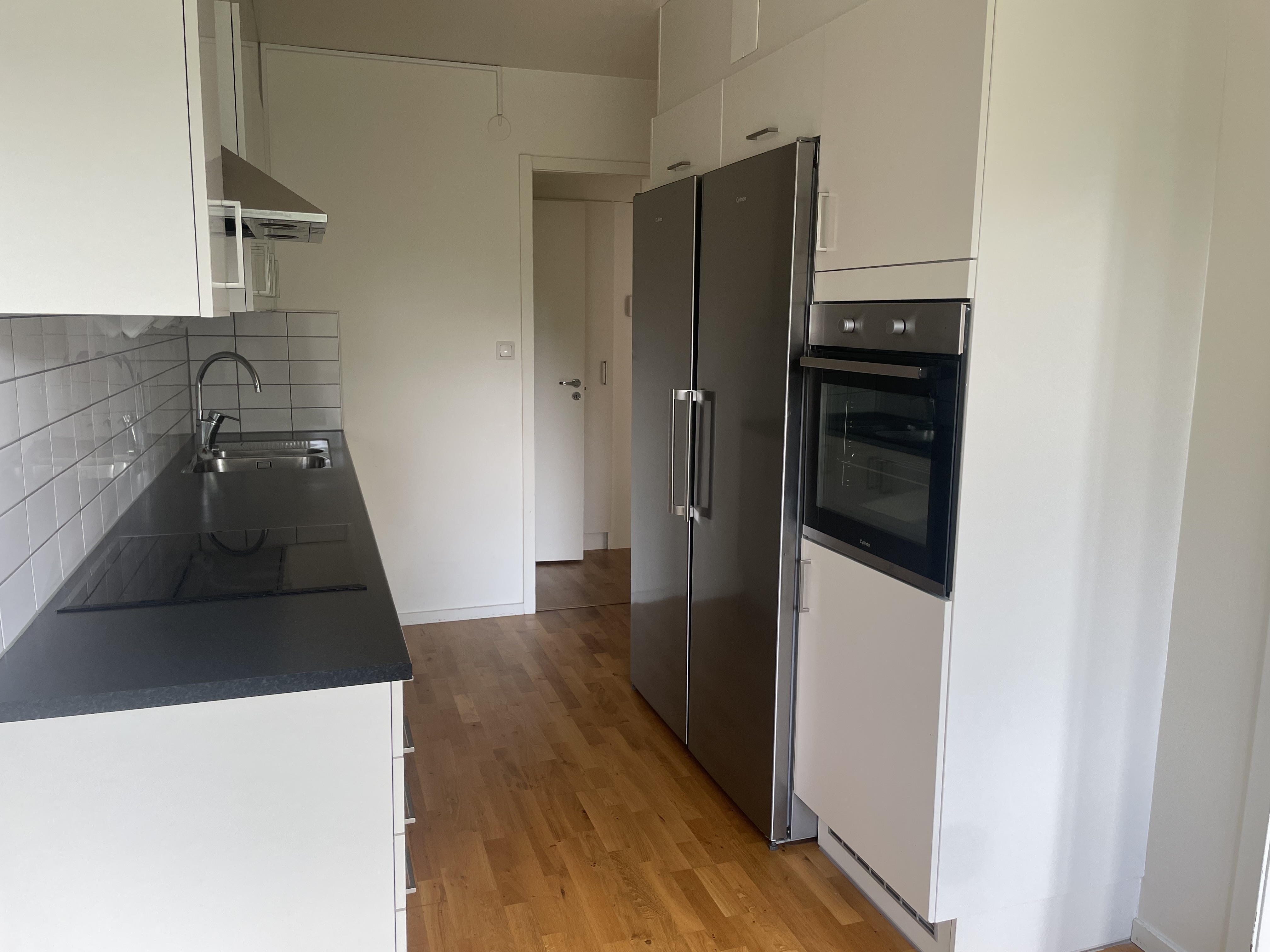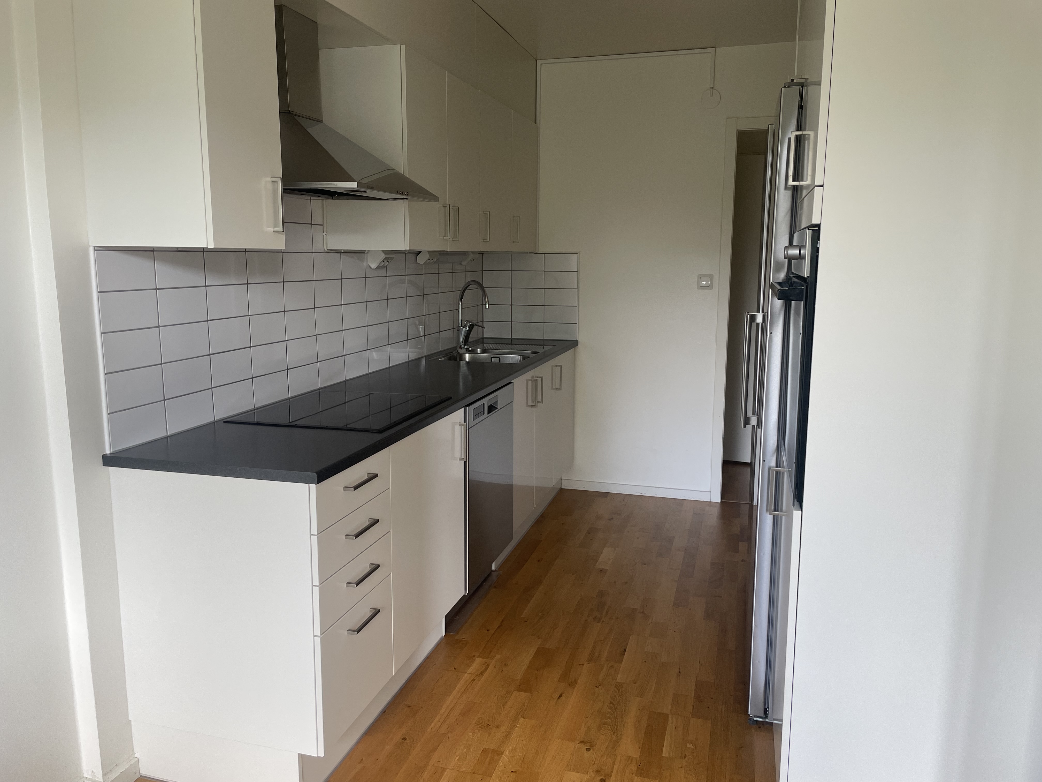 Köksinredningen går i vitt, spishäll, inbyggnadsugn och vitt kakel ovanför diskbänken. Rostfria Energisnåla vitvaror. Lägenheten har diskmaskin, tvättmaskin, torktumlare och säkerhetsdörr.