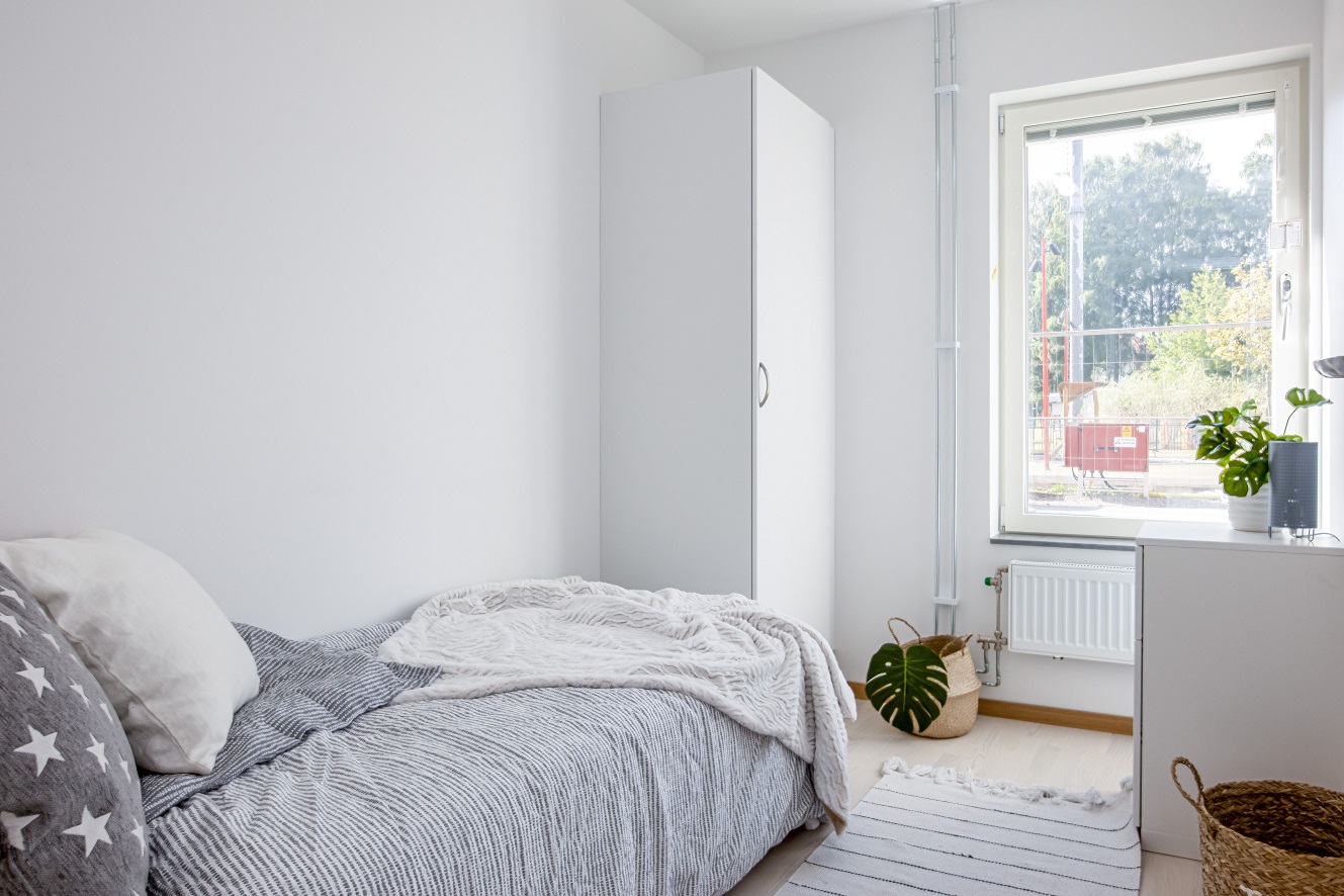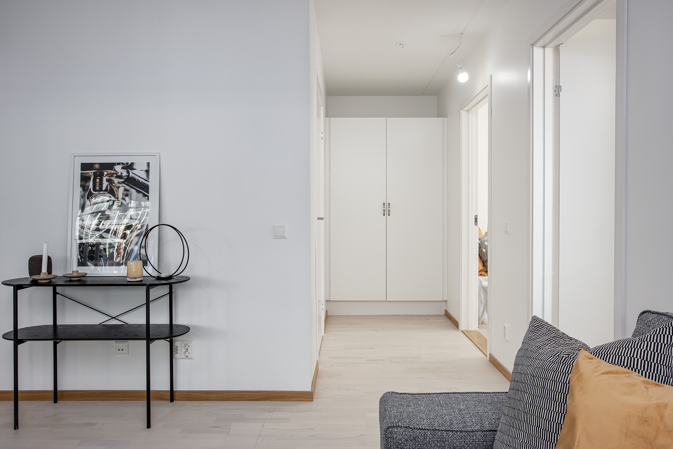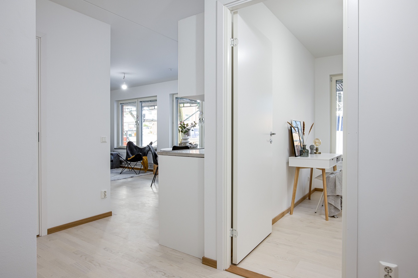Generellt är det vitmålade väggar, vita innerdörrar och ljus ekparkett i samtliga rum. Persienner ingår.
