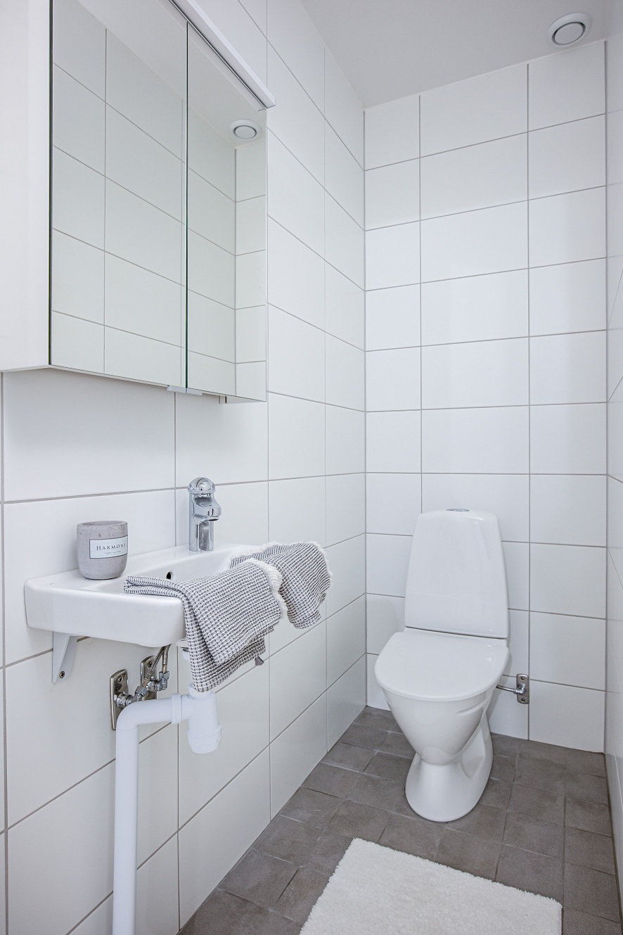 Badrummen är helkaklade med vitt kakel på väggar och grå klinkers på golv. Spegelskåp ovanför handfatet med en vit kommod, duschväggar och tvättmöjligheter i lägenheten är standard. Separat tvättmaskin och tumlare.