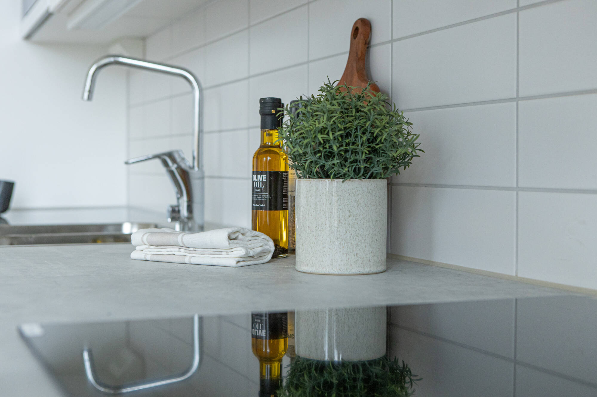 Köket har vita Ballingslöv köksluckor, vitt kakel och ljusgrå melerad bänkskiva. Vita vitvaror från Electrolux såsom kyl/frys, diskmaskin, mikrovågsugn, induktionshäll, inbyggnadsugn med varmluft och kolfilterfläkt.