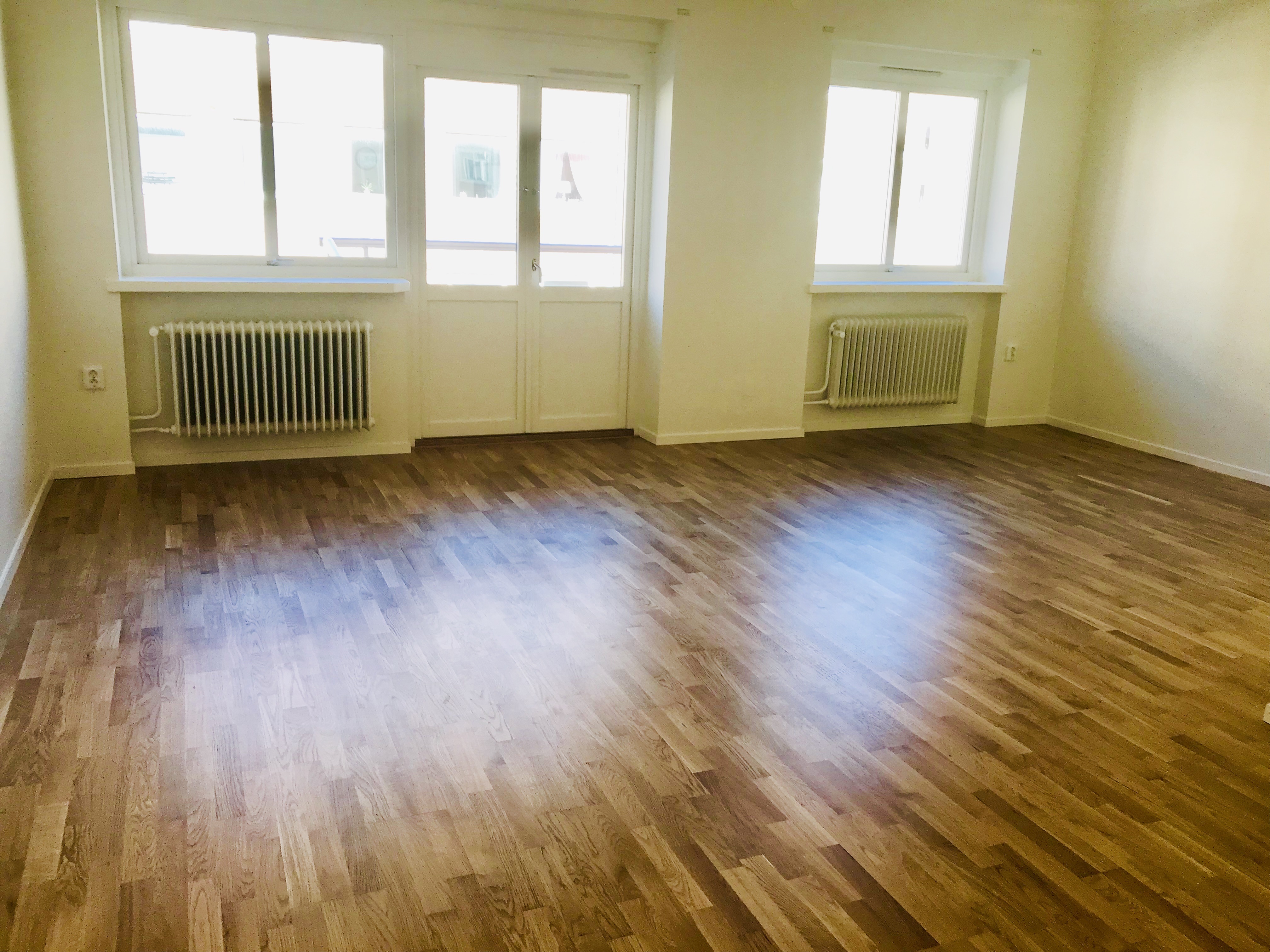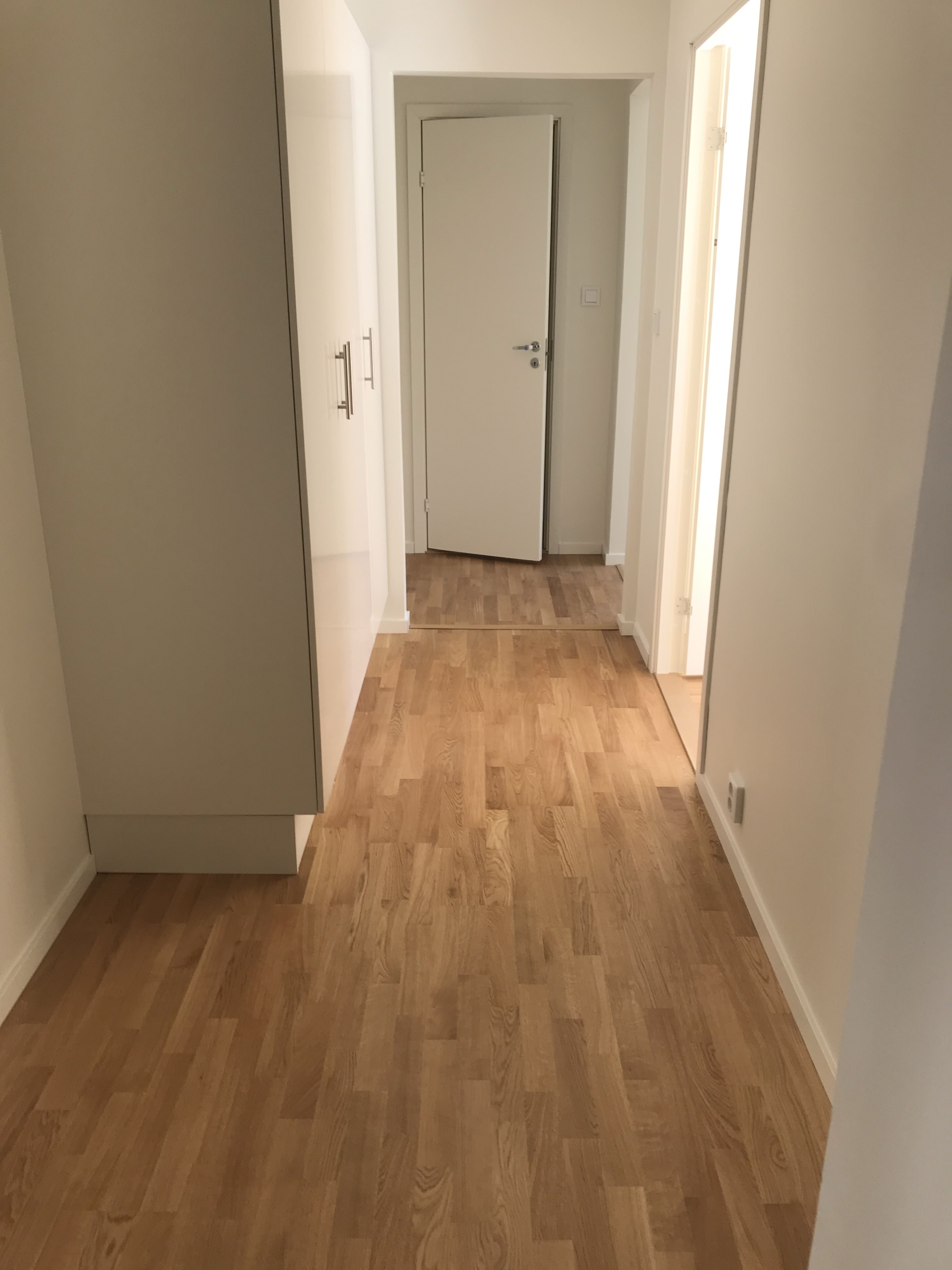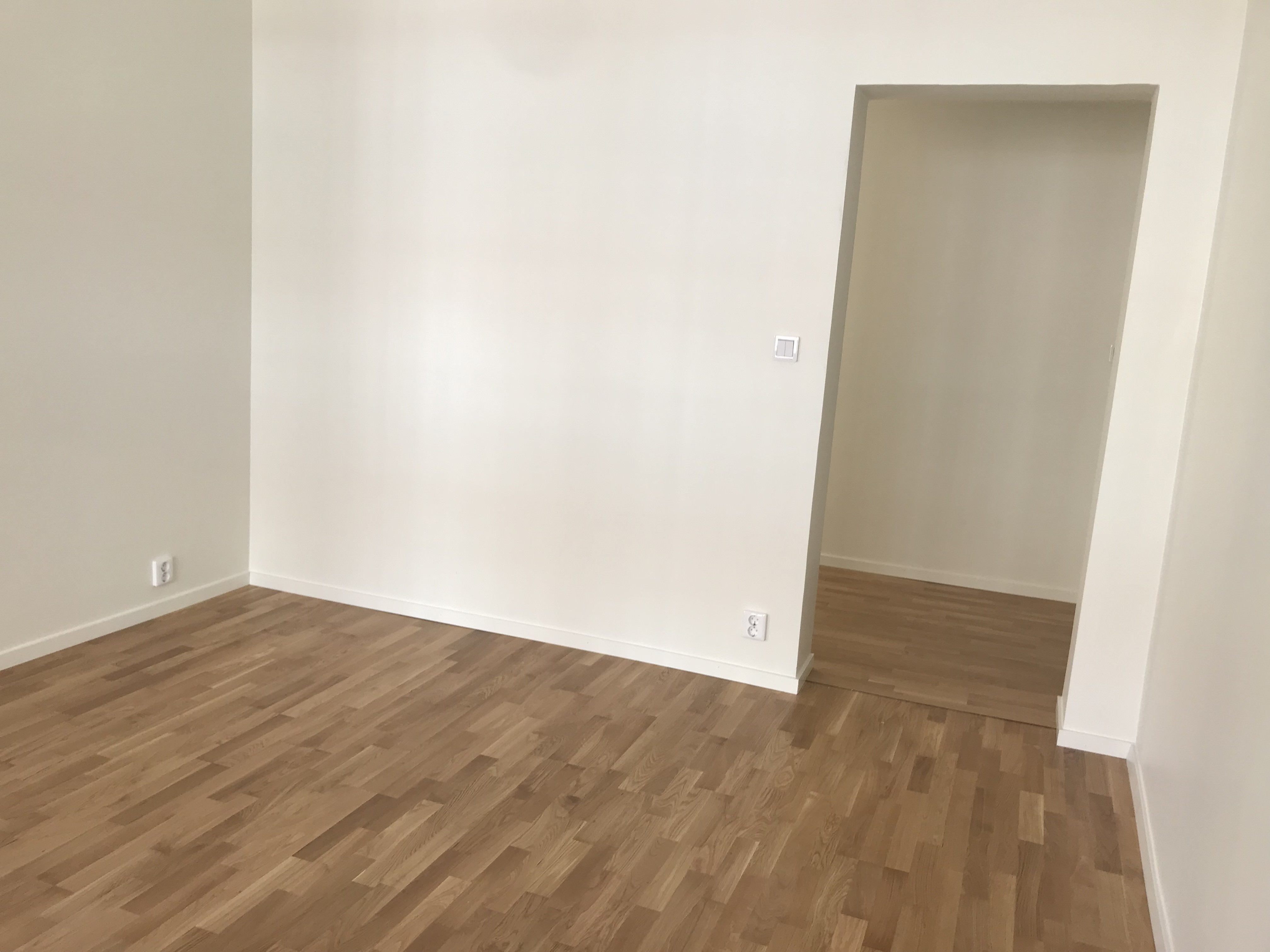 Lägenheten har ett vackert ekparkettgolv genomgående i hela lägenheten förutom en liten ruta med grått klinkergolv i hall. Väggar, tak och snickerier är vitmålat.