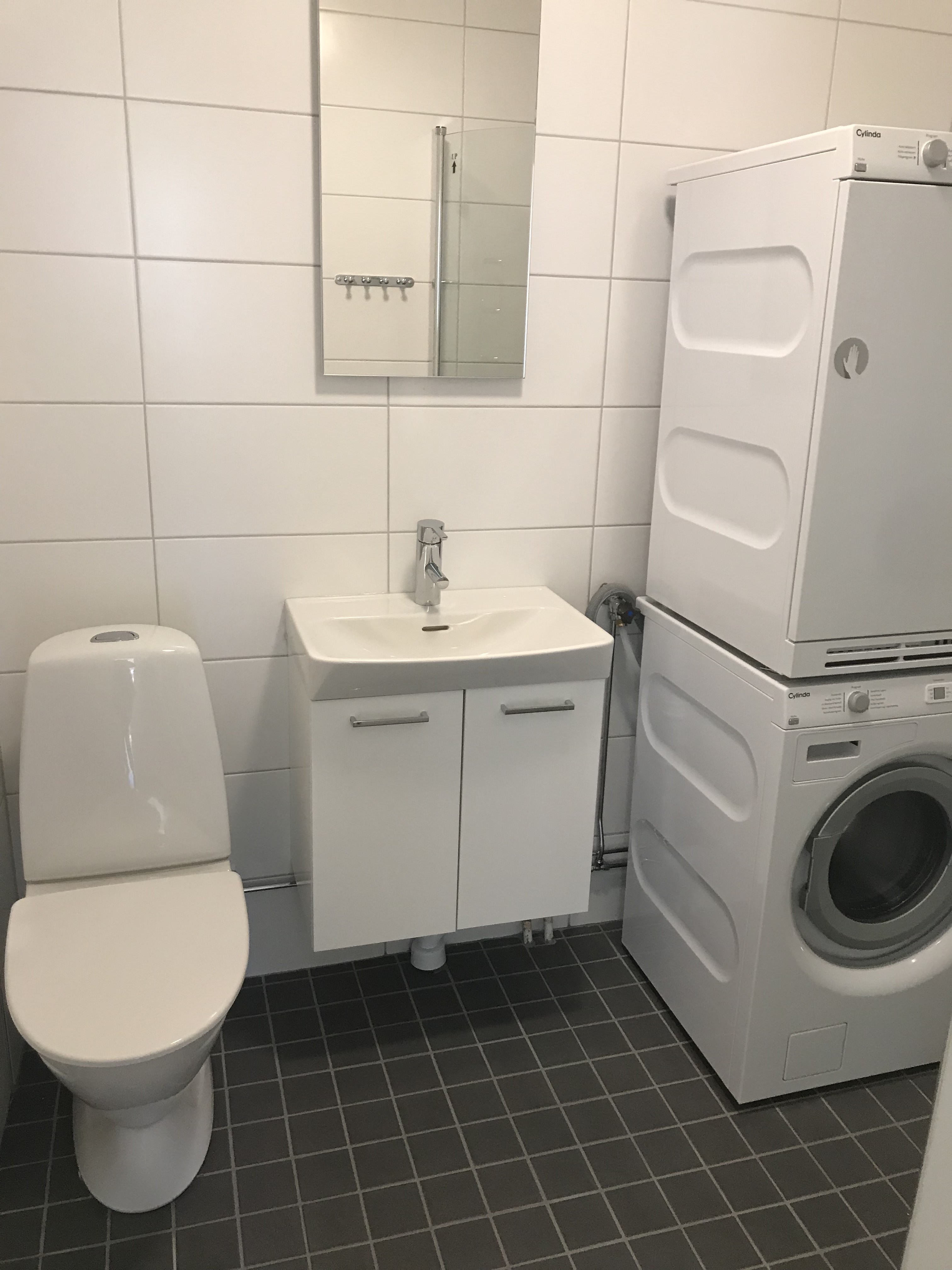 Badrummet har helkaklade väggar i vitt och grå klinker på golvet. Duschen med glasdörrar som kan vikas inåt när duschen inte används, vilket ger bättre golvyta. Tvättmaskin och torktumlare finns.