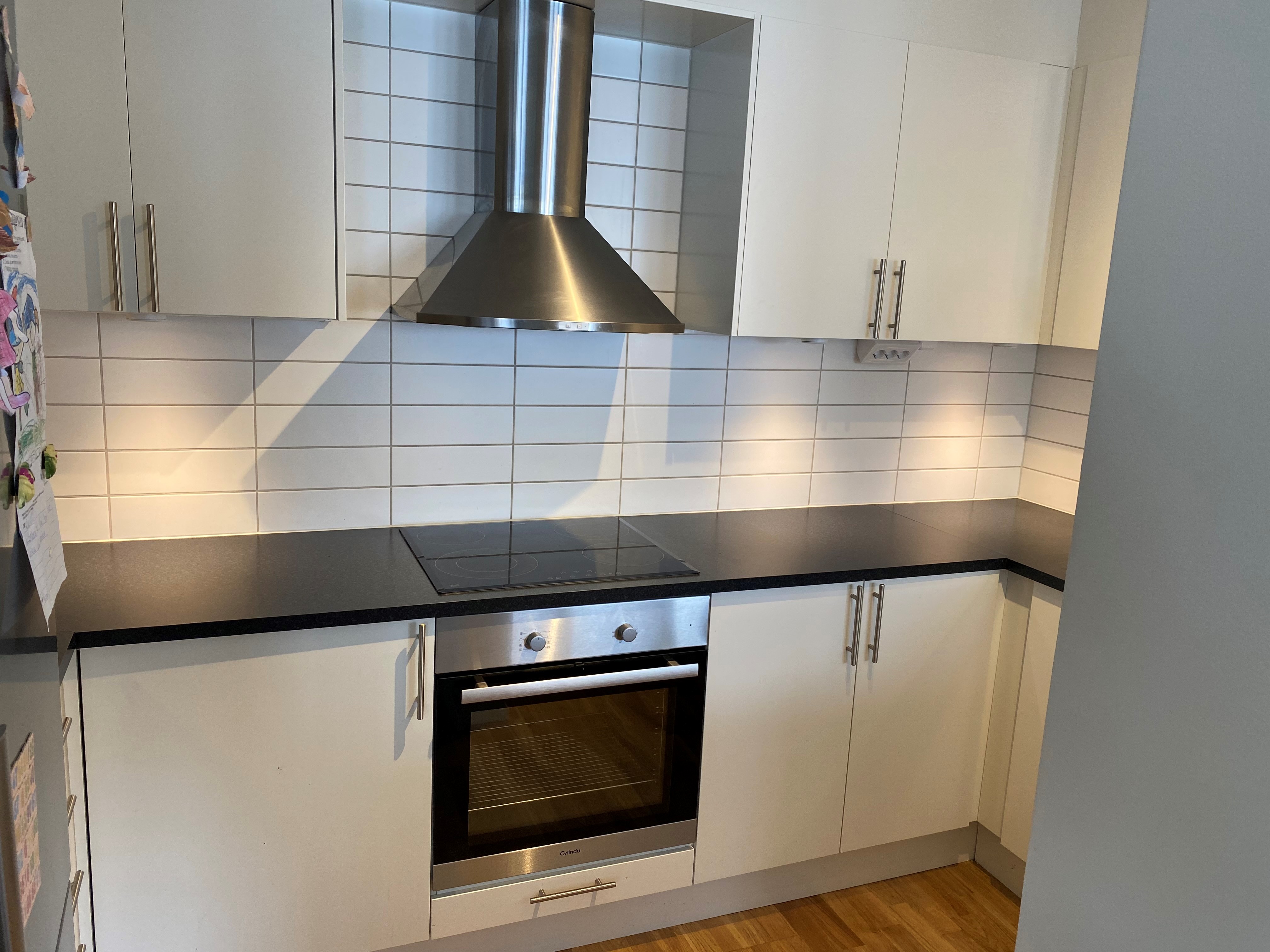 Vitt kök med spishäll, inbyggnadsugn och vitt kakel ovanför diskbänken