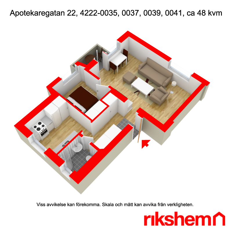 Rikshem reserverar sig mot eventuella fel eller avvikelser som kan förekomma i lägenhetsannonsen eller i planritningen.