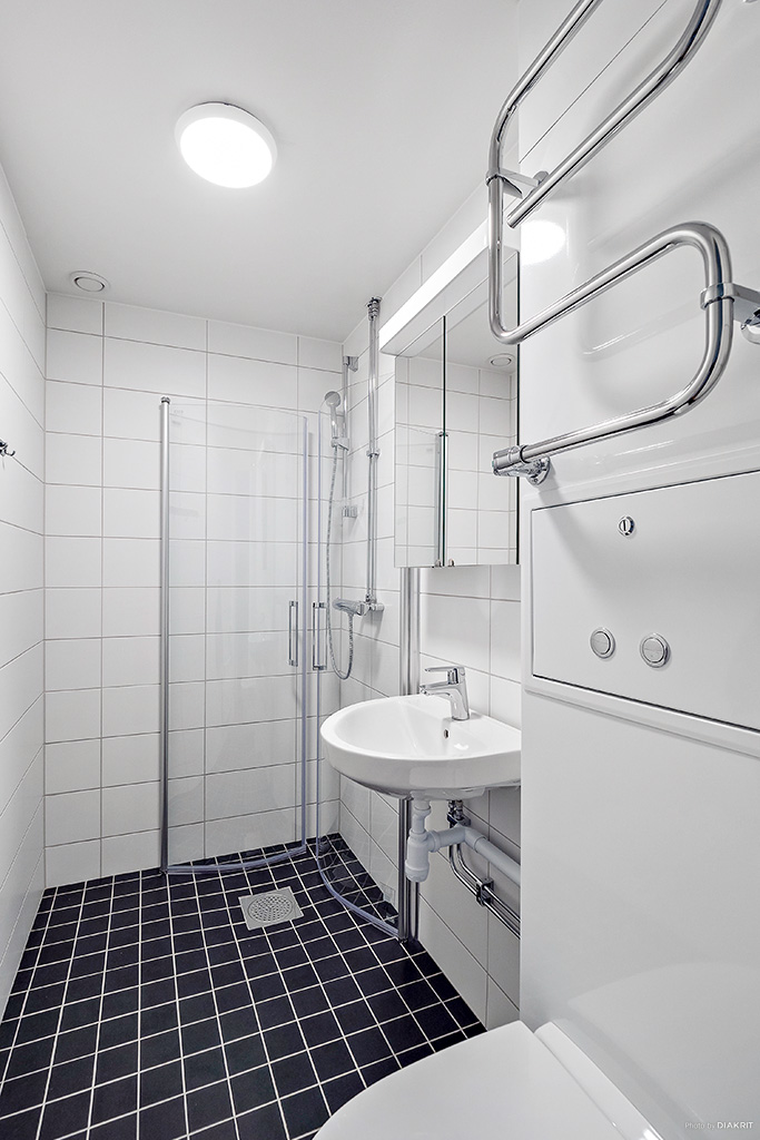 Väggarna är vitmålade och det är genomgående parkettgolv förutom i hall och kök där det är grått klinkergolv. Köket är ljust med vit köksinredning och grå bänkskiva. Lägenheten har diskmaskin.