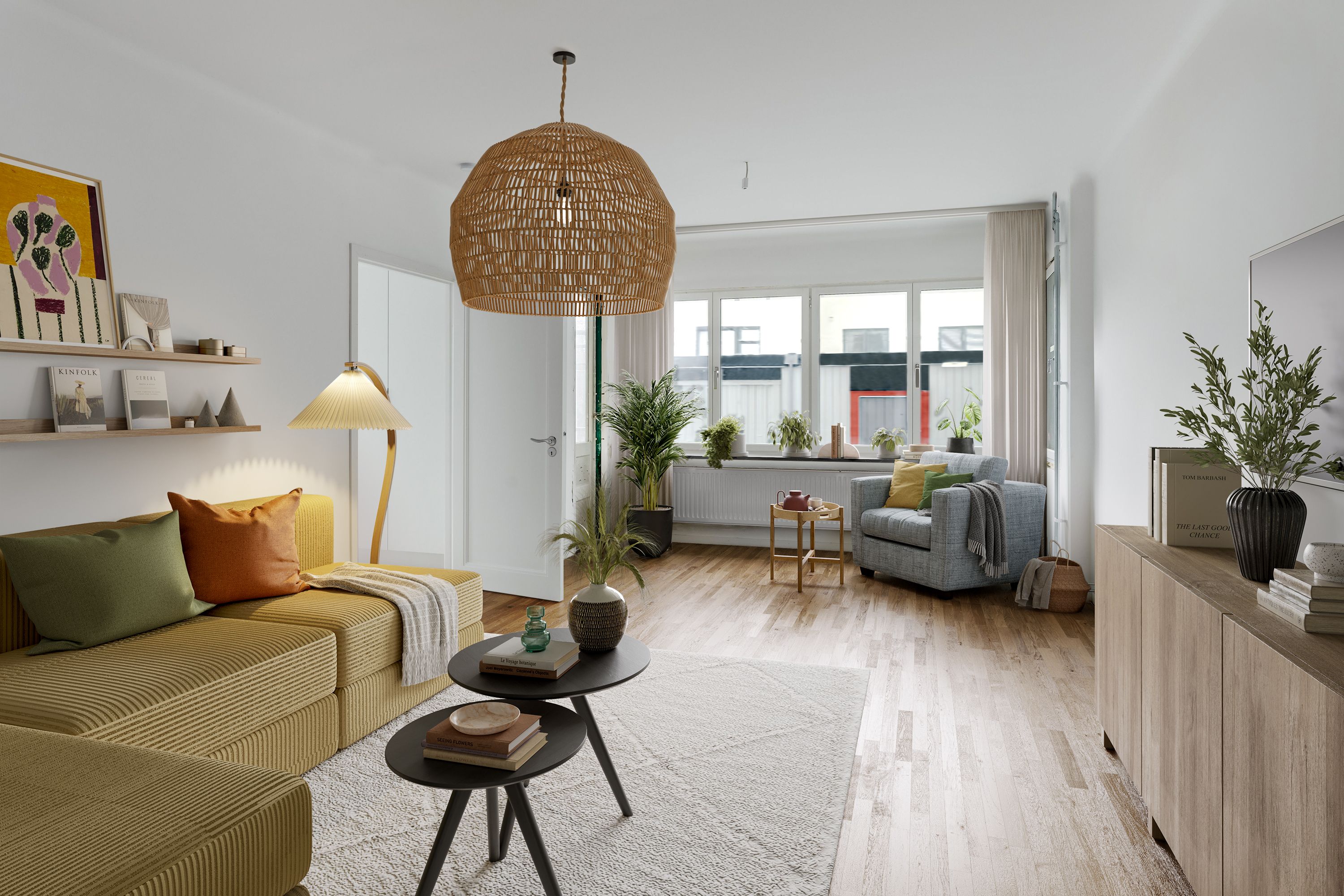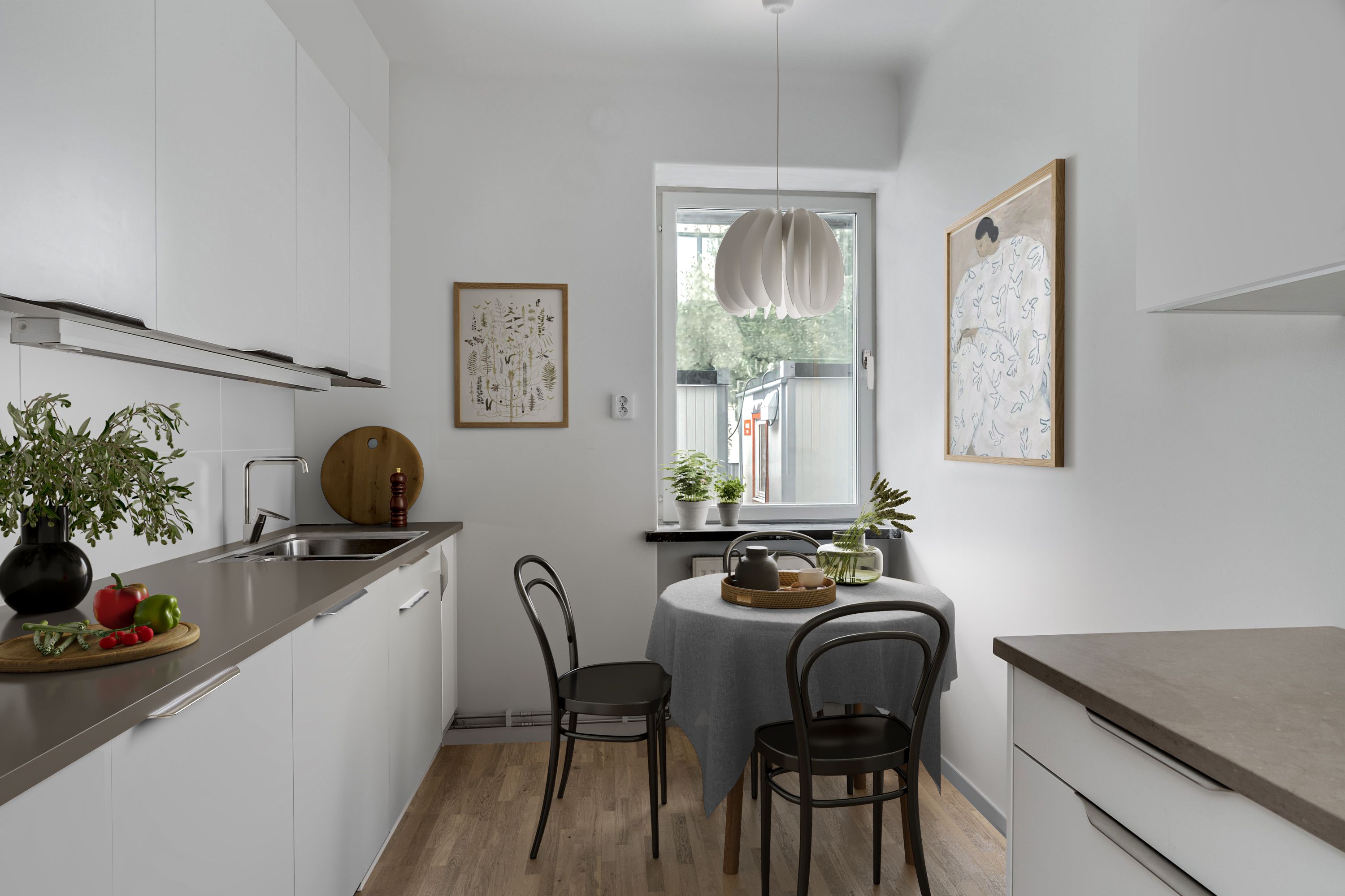 Genomgående vackert ekparkettgolv ger en varm och harmonisk känsla i hela lägenheten. I hallen finns ett praktiskt parti med grått klinkergolv – perfekt för skor och ytterkläder. Väggar, tak och snickerier är vitmålade och skapar en ljus, modern och lättmöblerad bas.