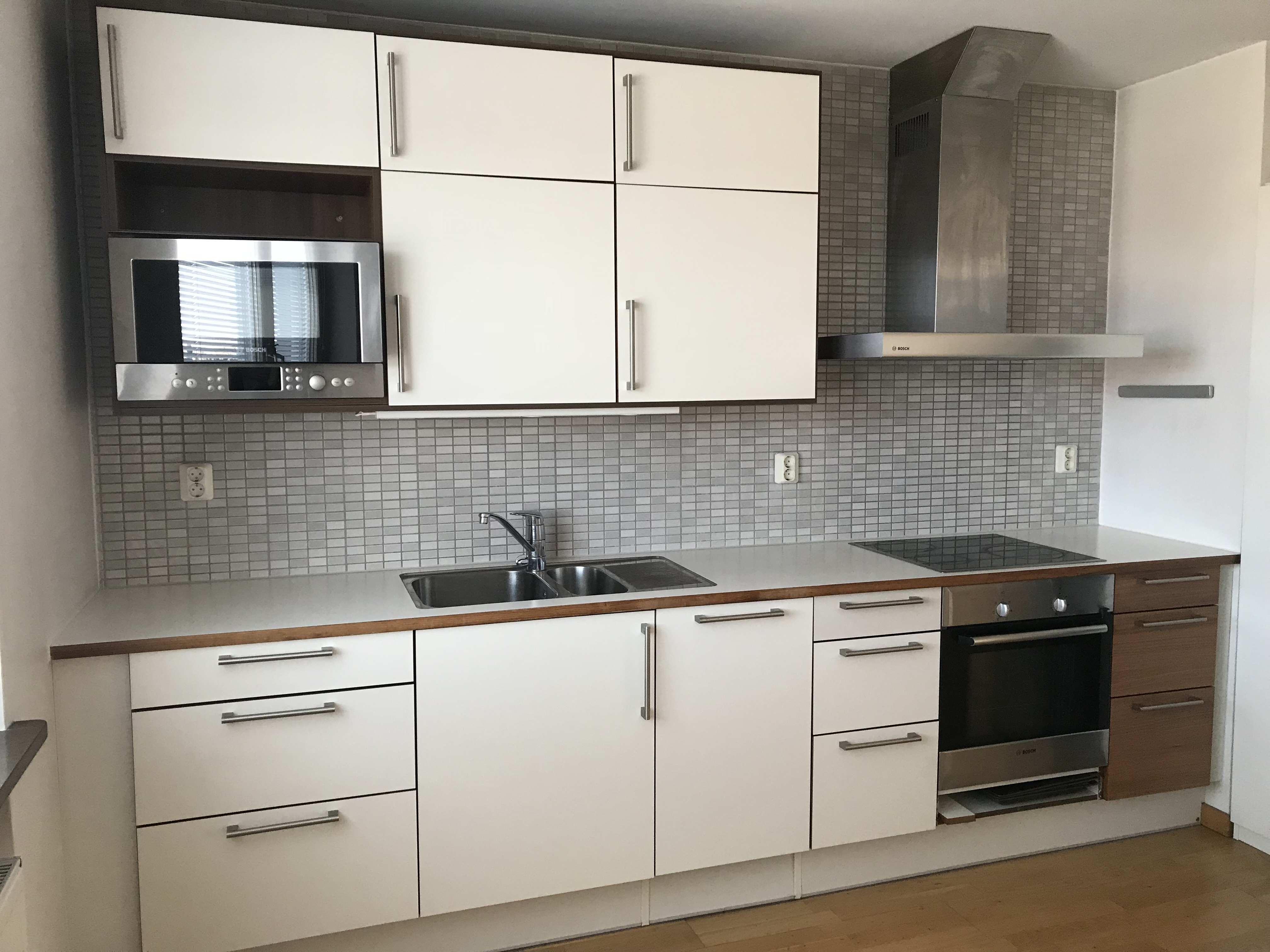 Köket har träfärgade köksluckor, spishäll, inbyggnadsugn och ljusgrått kakel ovanför diskbänken. Rostfria energisnåla vitvaror. Lägenheten har ett ekparkettgolv genomgående i hela lägenheten. Väggar, tak och snickerier är vitmålat.