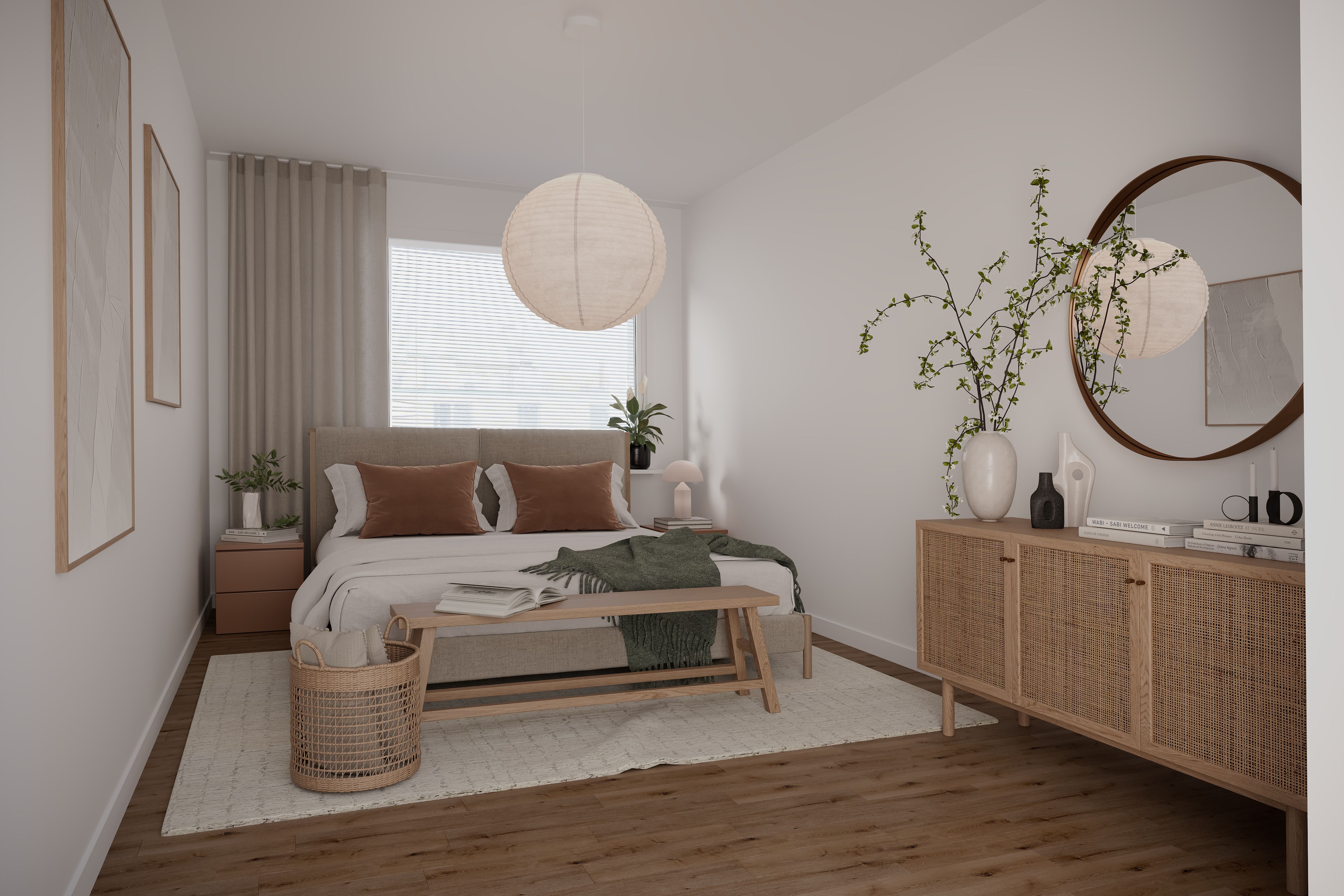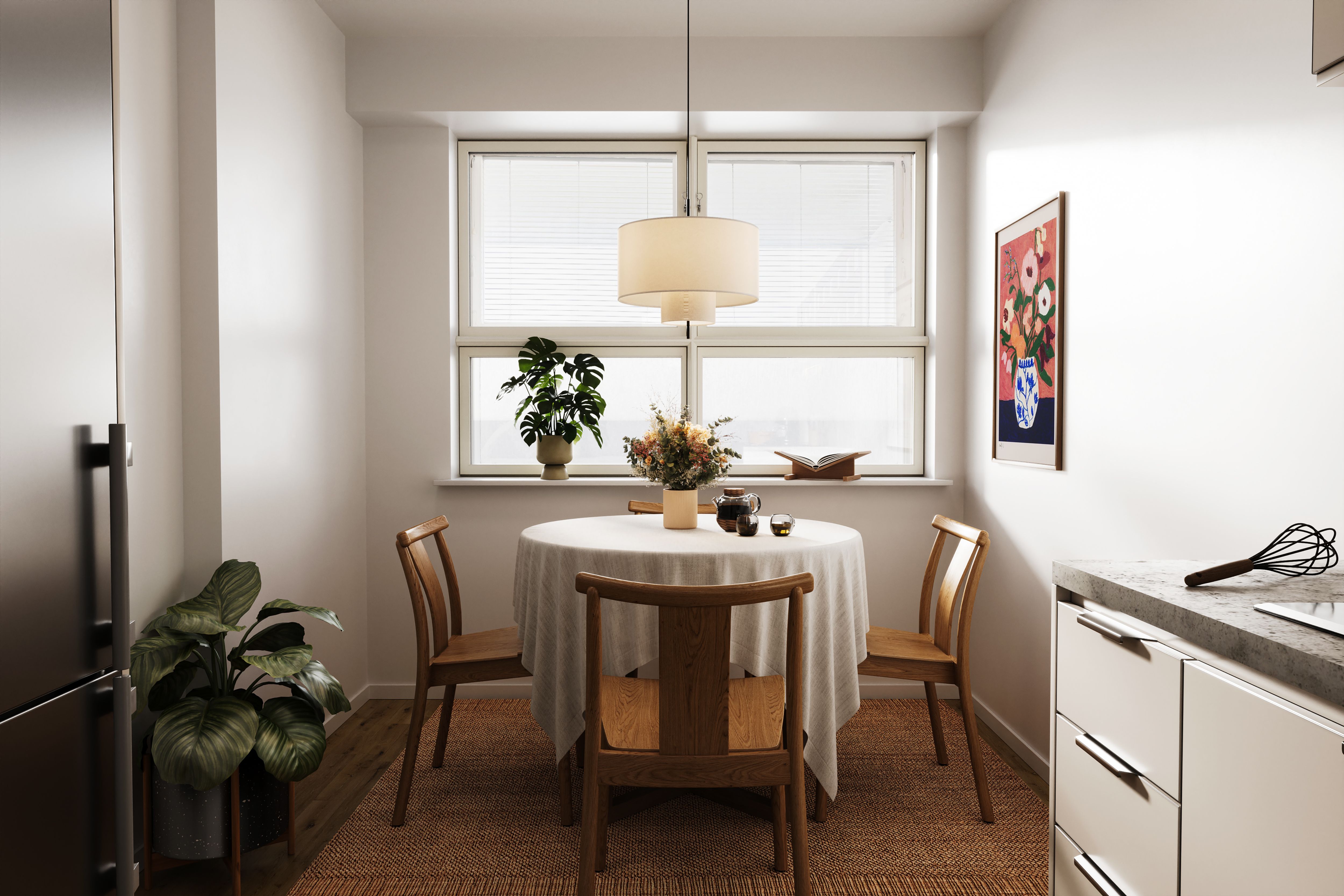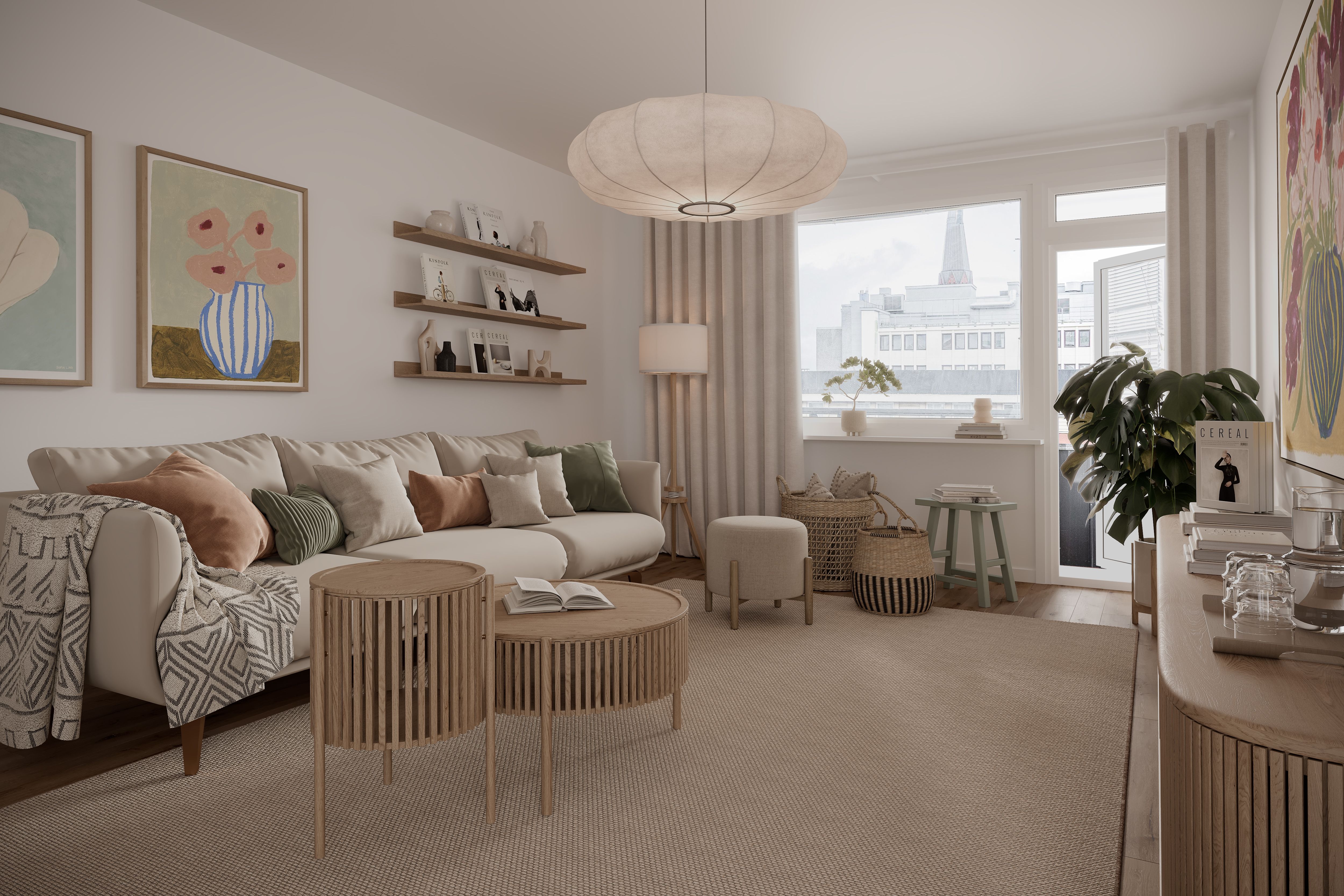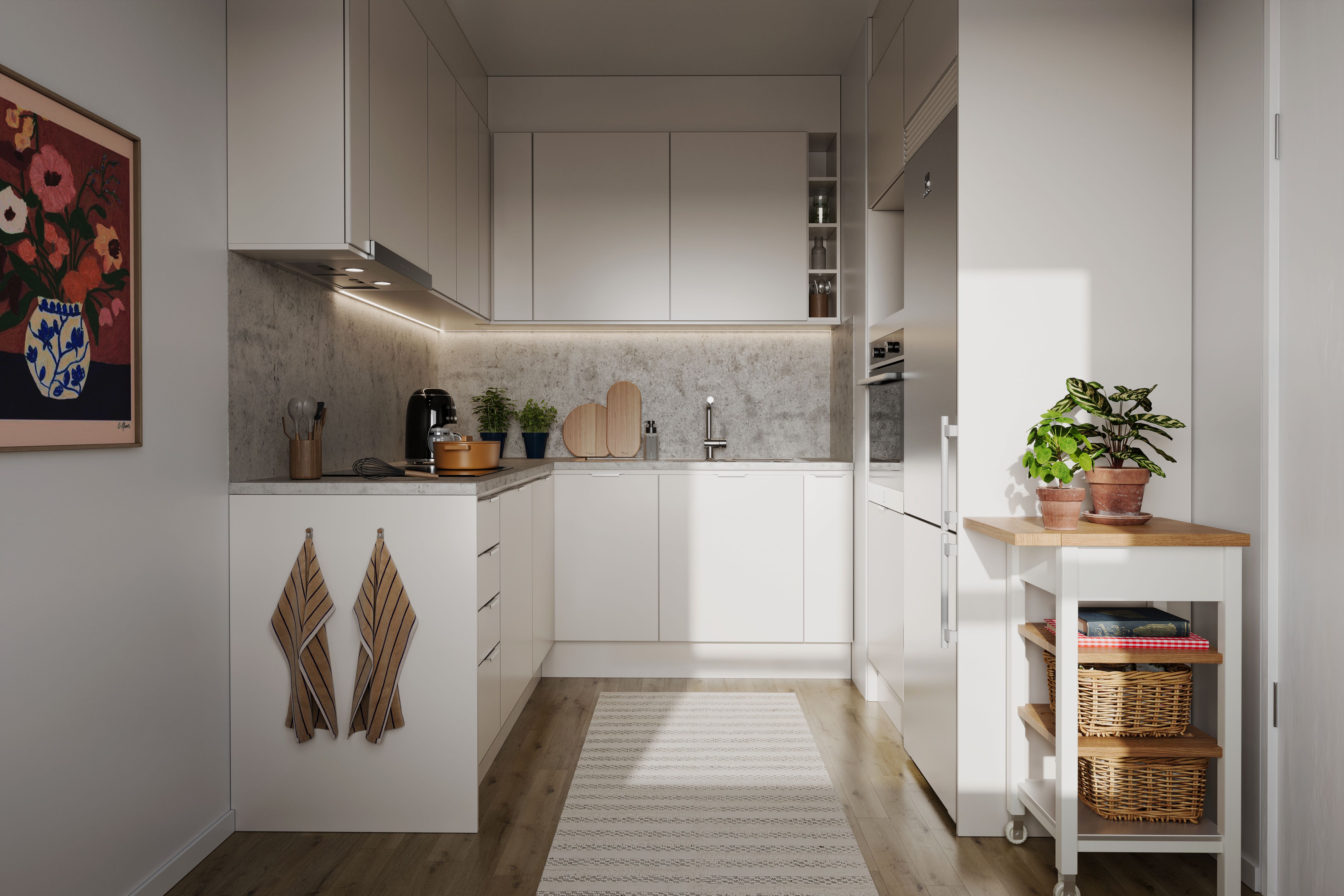 Samtliga bilder är E-stylade visualiseringsbilder från annan lägenhet i fastigheten med likadan planlösning men spegelvänd.