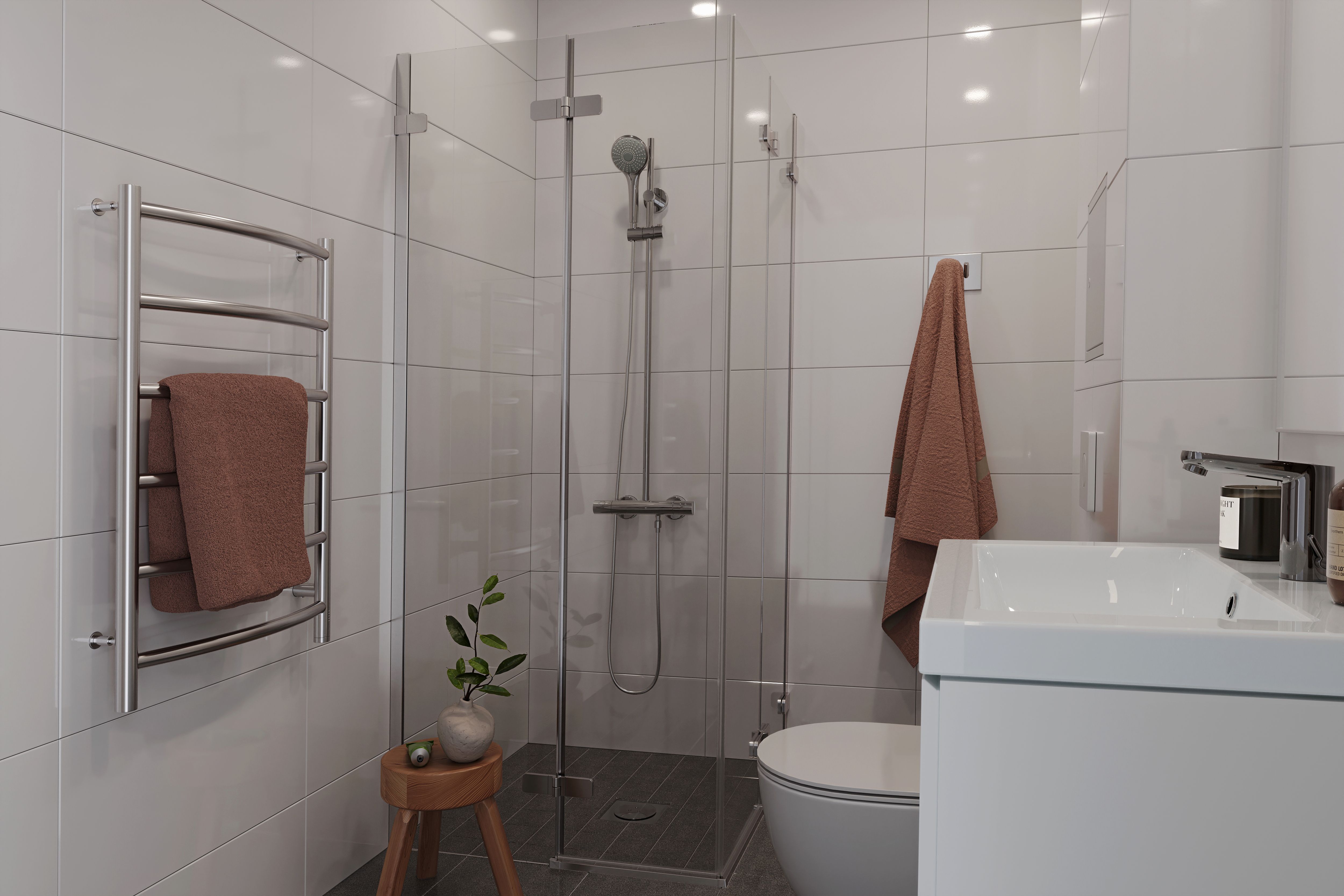 Badrummet har ett vackert varmgrått klinkergolv med golv-värme. Vita helkaklade väggar. Duschutrymmet har smidiga glasdörrar som kan vikas inåt och nytt handfat med tillhörande vitt underskåp samt ny spegel. Innertak i badrum har LED-spotlights.