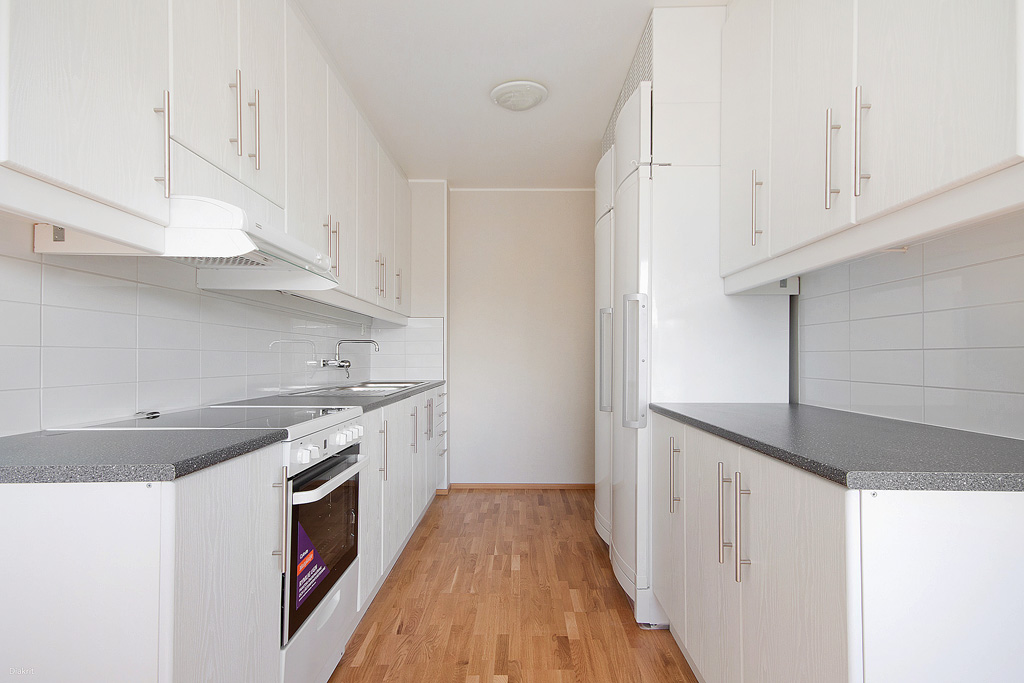 Här erbjuder vi dig en ljus och modern 4 rum och kök med tapetserade väggar i ljusa toner och genomgående ekparkettgolv som tillsammans skapar en varm och inbjudande känsla. Det stilrena och funktionella köket är utrustat med diskmaskin, inbyggnadsugn samt spis med glaskeramikhäll. Intill köket finns en rymlig matsal i öppen anslutning till vardagsrummet, med utgång till en balkong i härligt sydöstläge.