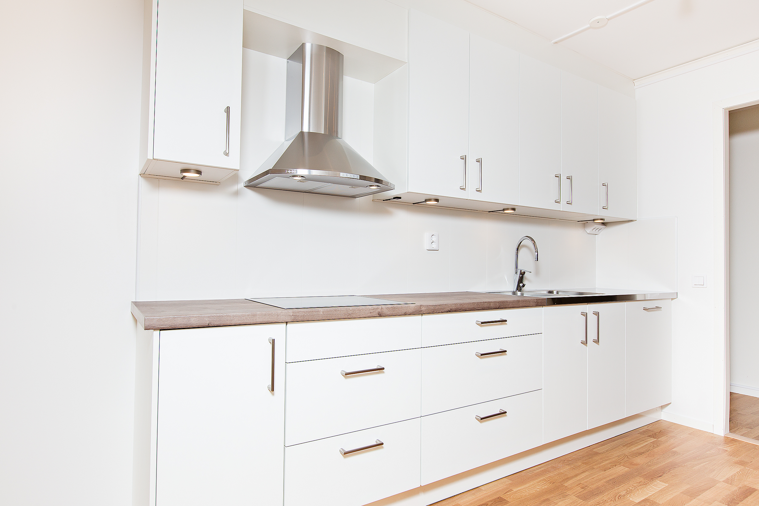 Lägenheten ligger 1 trappa upp i ett trevåningshus och har balkong. Bilderna är exempelbilder på materialval.