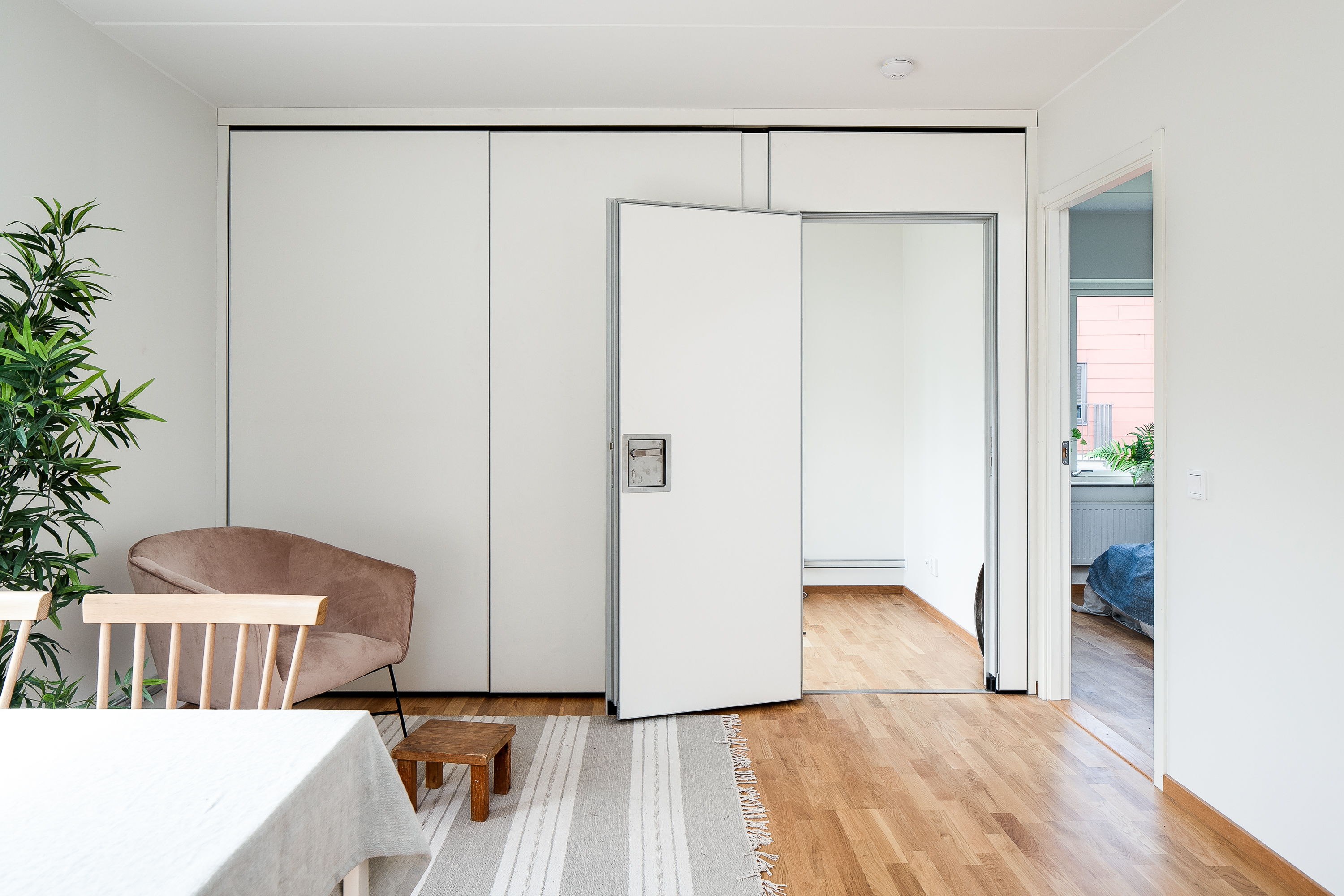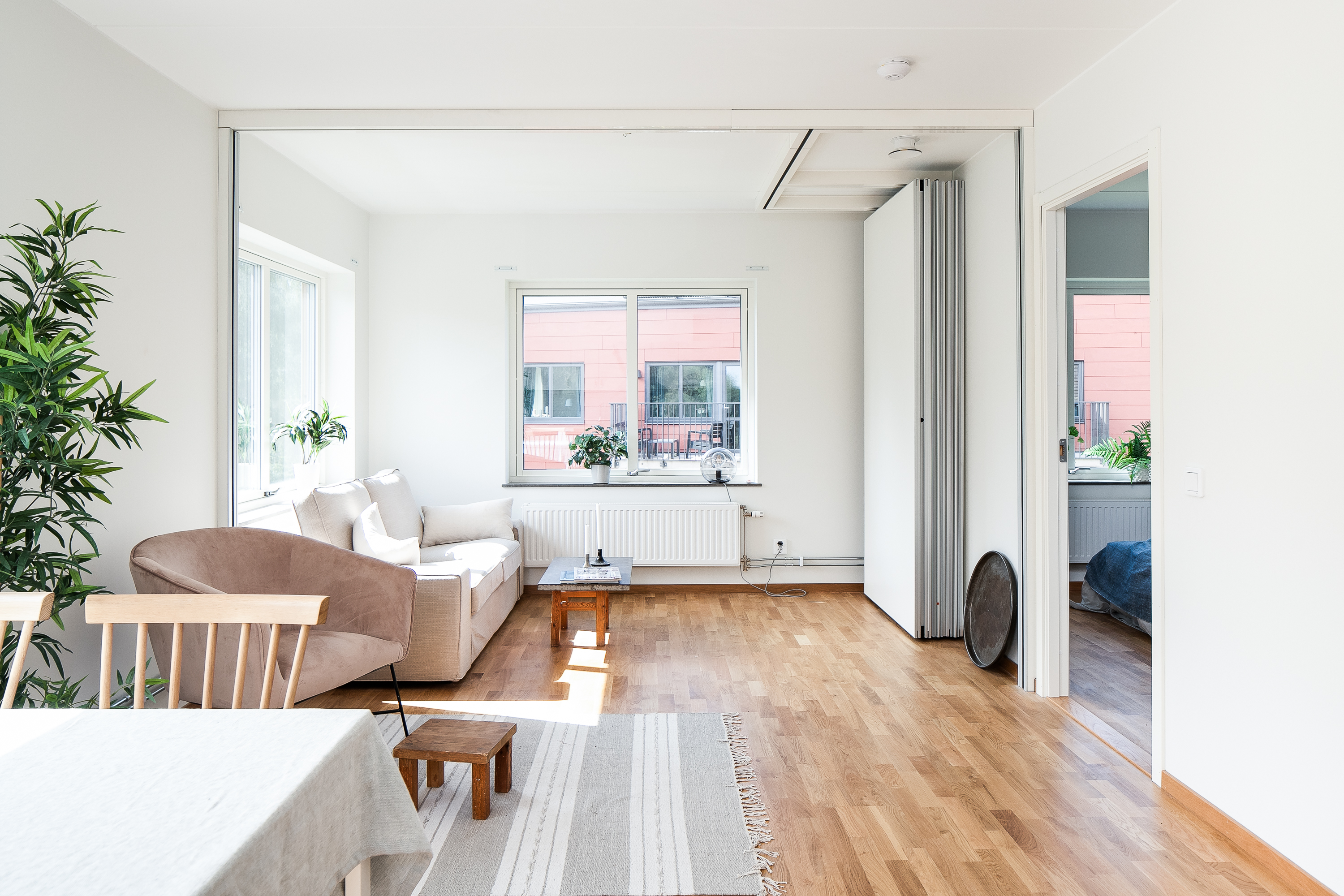 Lägenheten har en öppen planlösning mellan kök och vardagsrum. Diskmaskin finns i köket. Denna lägenhet kan du enkelt göra om till en 3:a med en så kallad vikvägg.