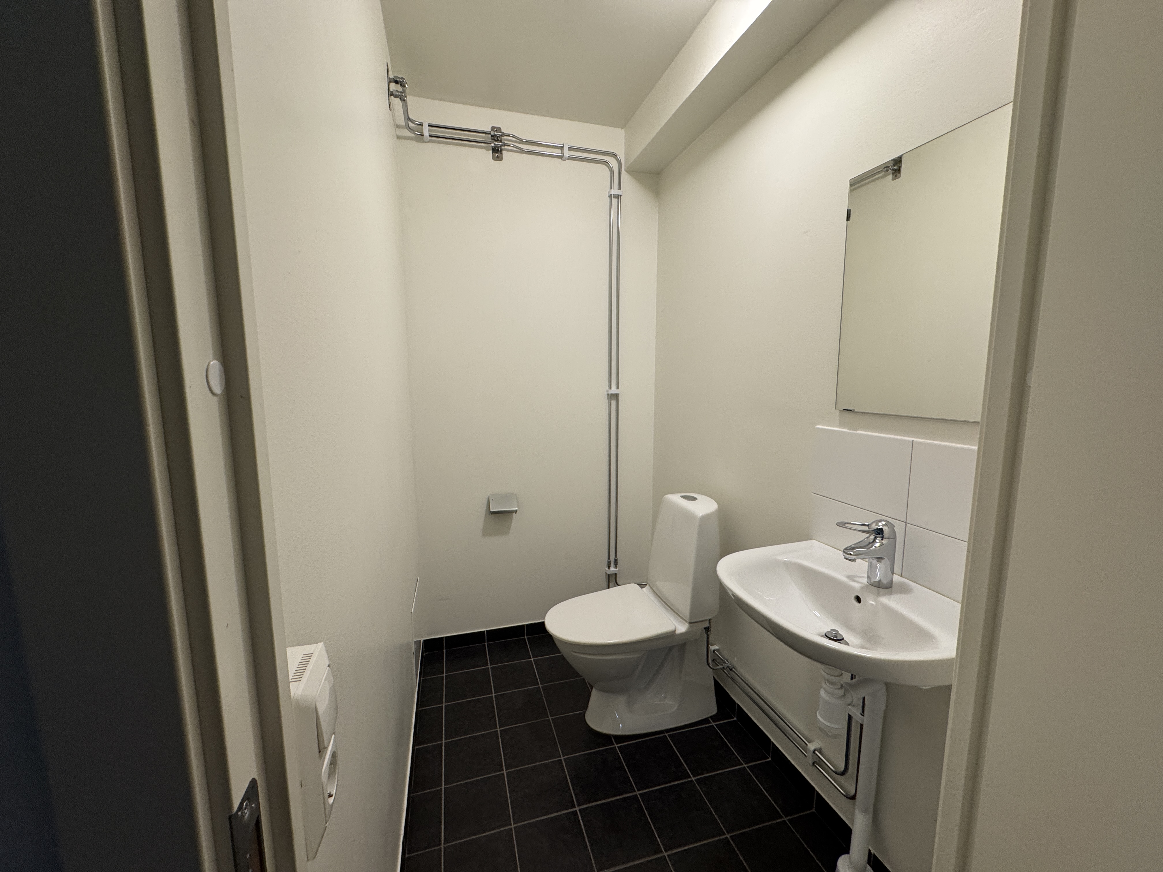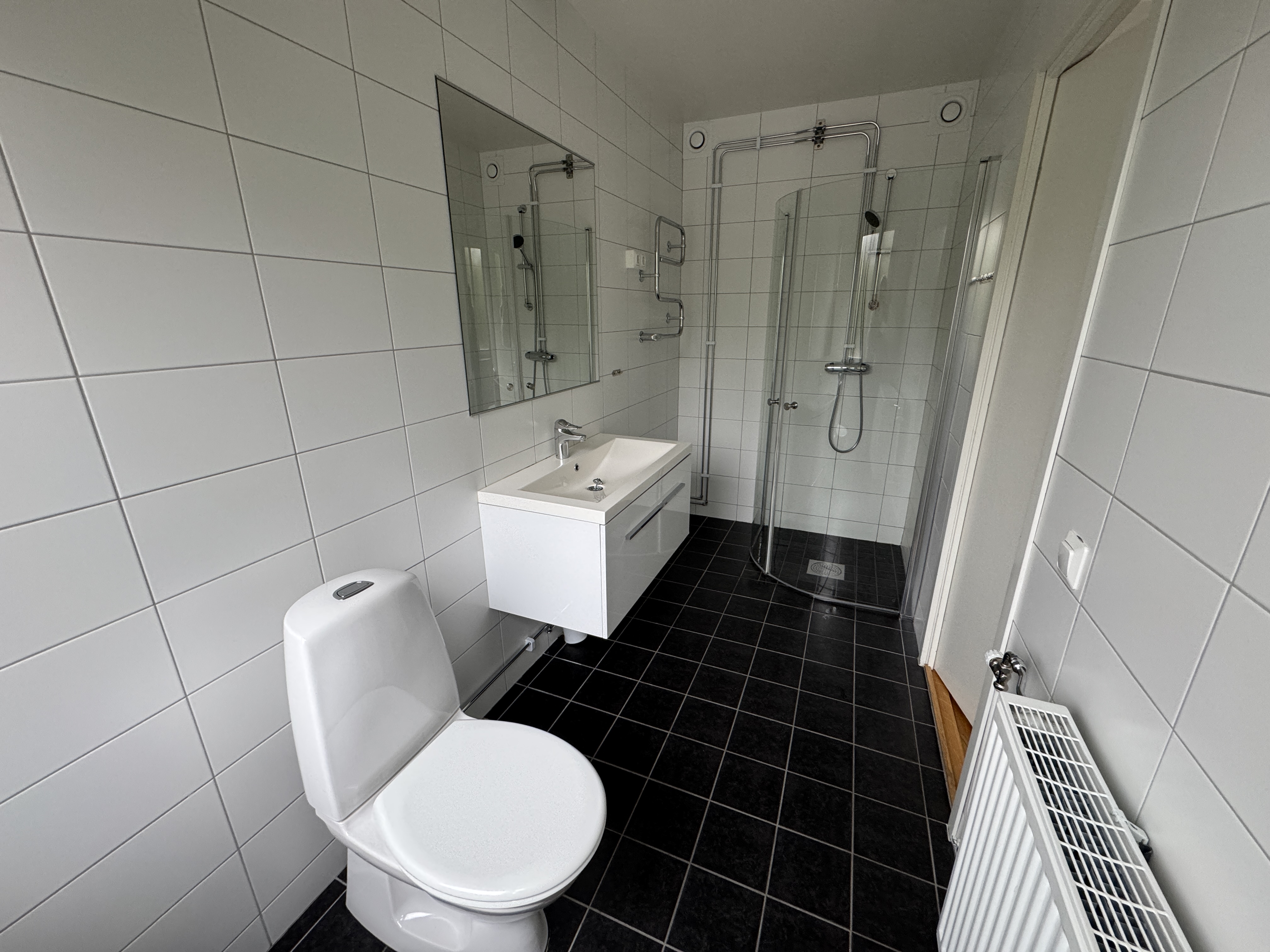 Badrum utrustat med dusch och förberett för tvättmaskin. Dessutom finns en mindre gästtoalett för extra bekvämlighet.