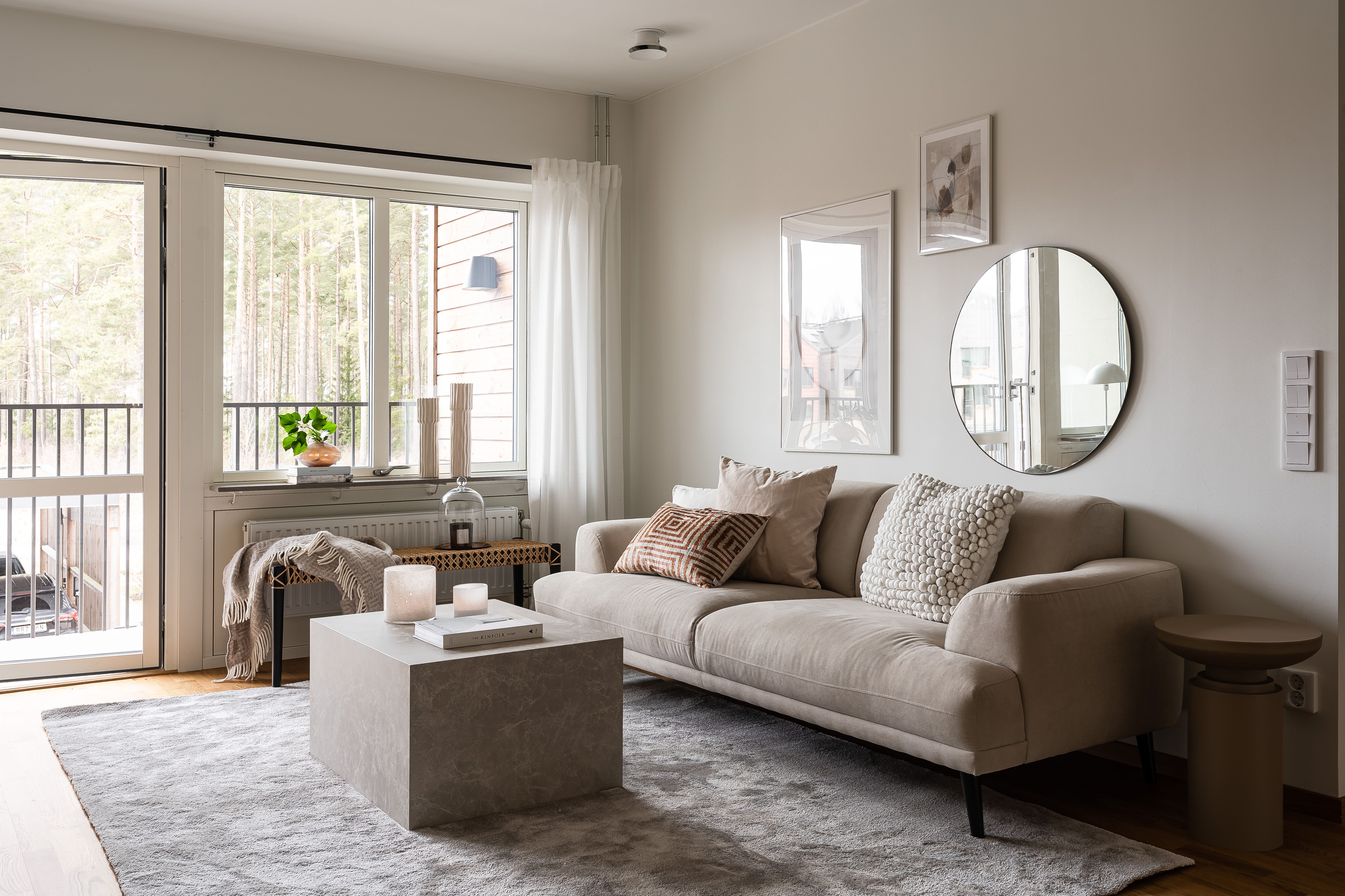Lägenheten har en öppen planlösning mellan kök och vardagsrum. Diskmaskin finns installerad i köket. Här finns bekvämligheter som balkong som nås från vardagsrum och att lägenheten är utrustad med säkerhetsdörr. Lägenheten har genomgående ekparkett och vitmålade väggar.