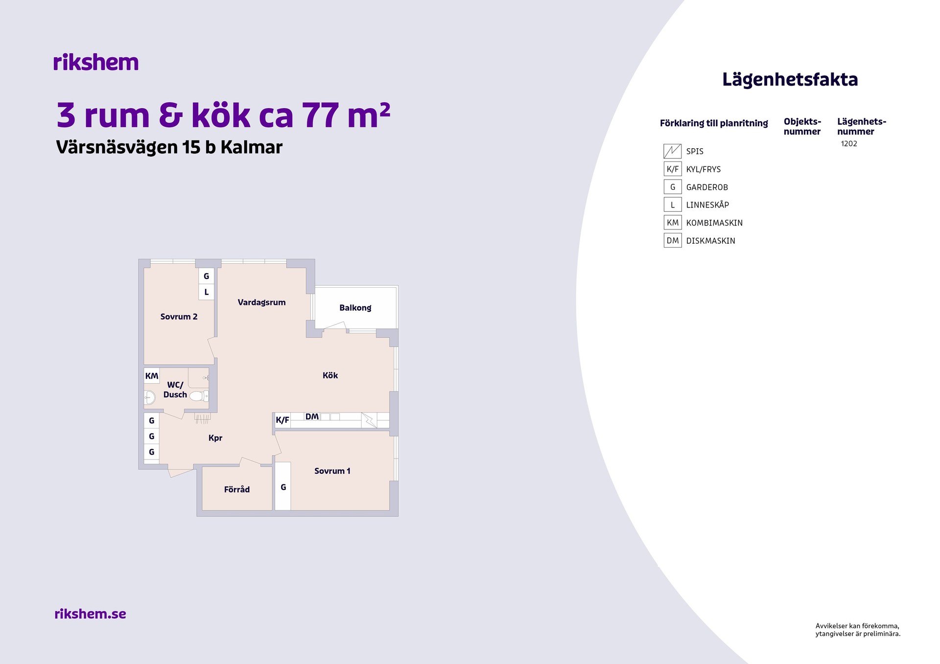 Rikshem reserverar sig mot eventuella fel eller avvikelser som kan förekomma i lägenhetsannonsen eller i planritningen.