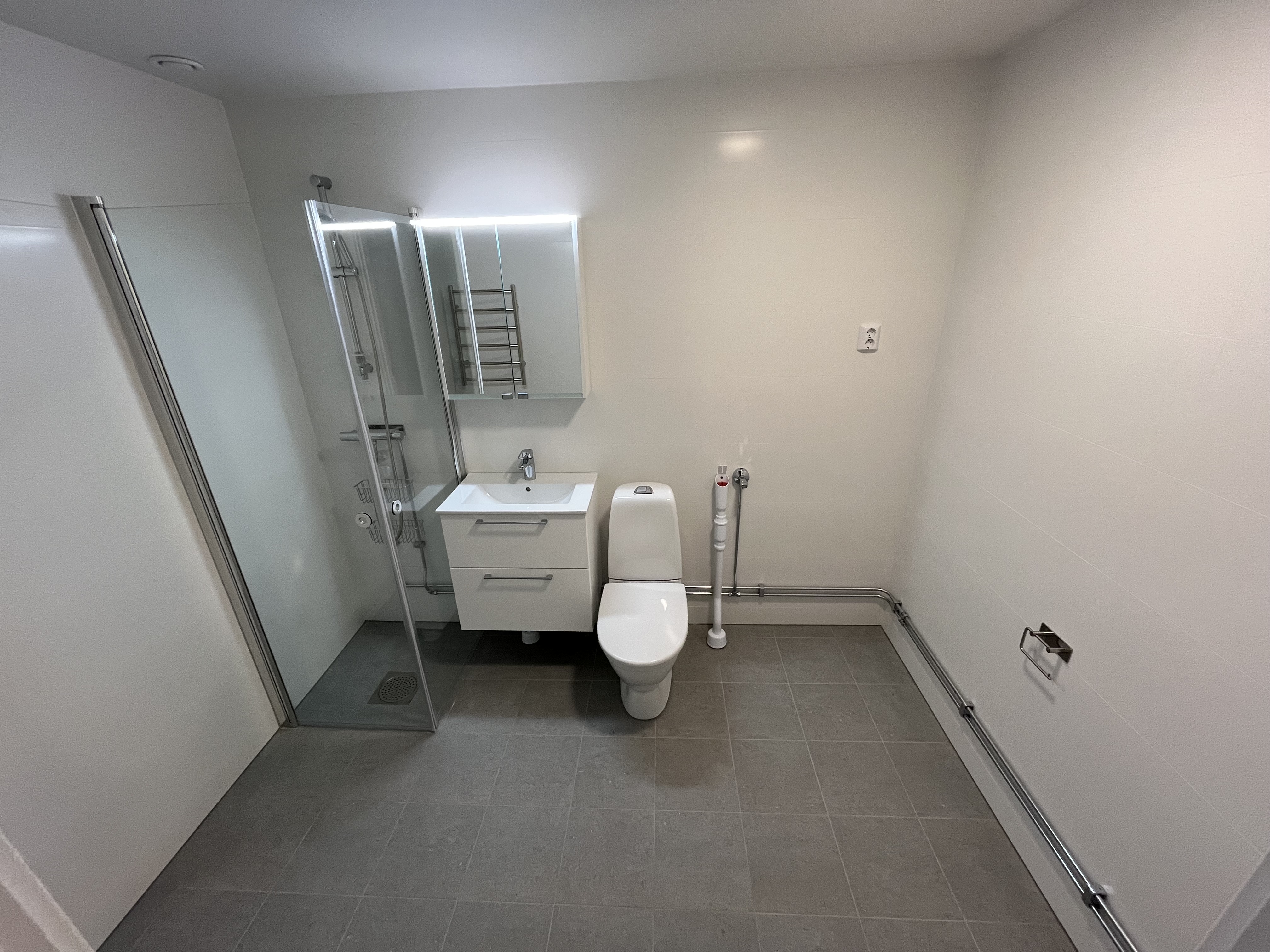 - Ett nyrenoverat badrum med dusch, WC och tvättställ.
