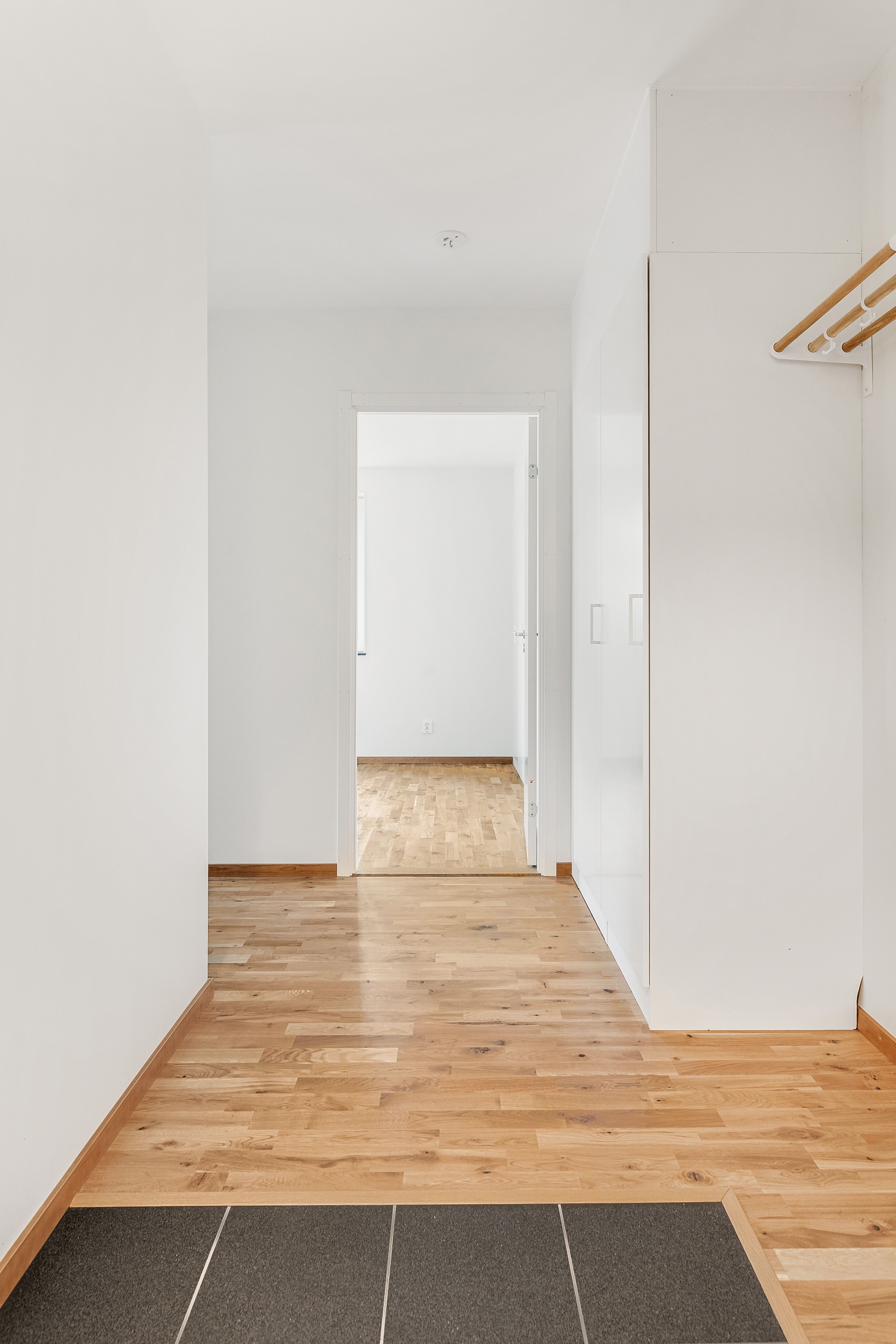 Praktisk hall med säkerhetsdörr, grått klinkergolv närmast entrén och kapphylla för klädupphängning. Bra med förvaringsytor i garderob och städskåp samt ett förråd på 2,6 m² med plats för extra förvaring. Till lägenheten ingår även ett mindre förvaringsutrymme som är beläget på entréplan.