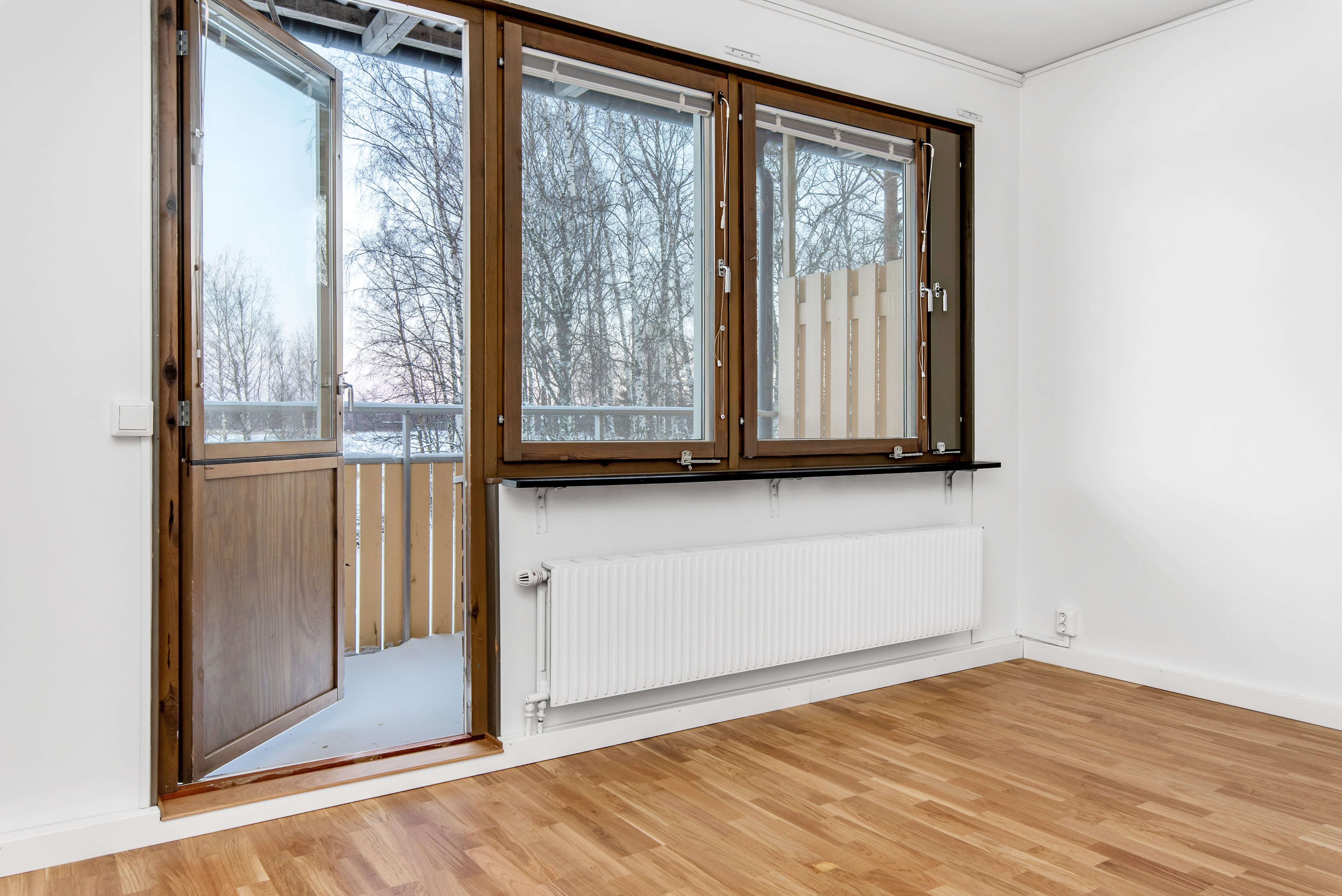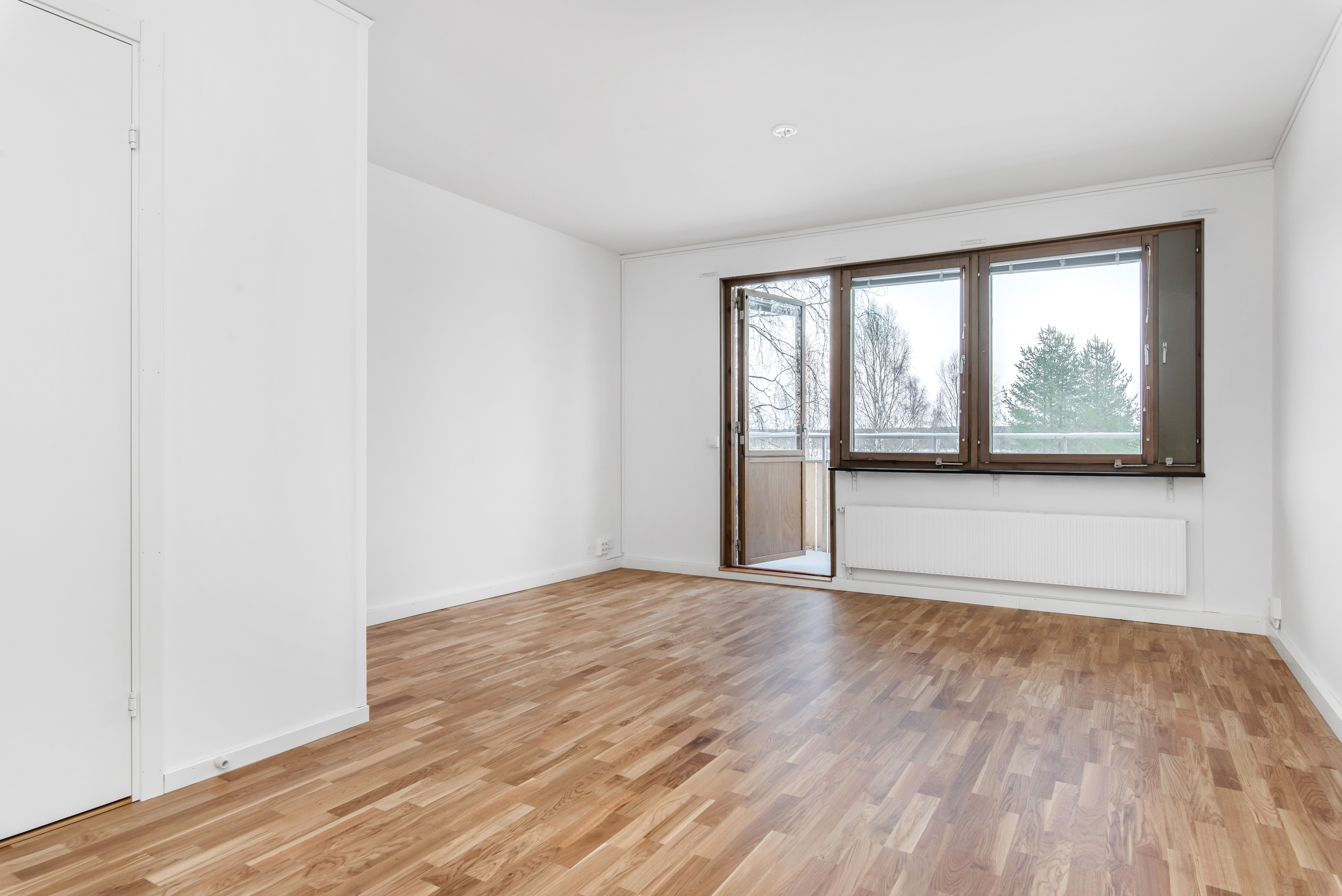 Rymligt allrum med ekparkettgolv, plats för säng, soffa och annat möblemang samt fint ljusinsläpp från fönster och utgång till balkong.