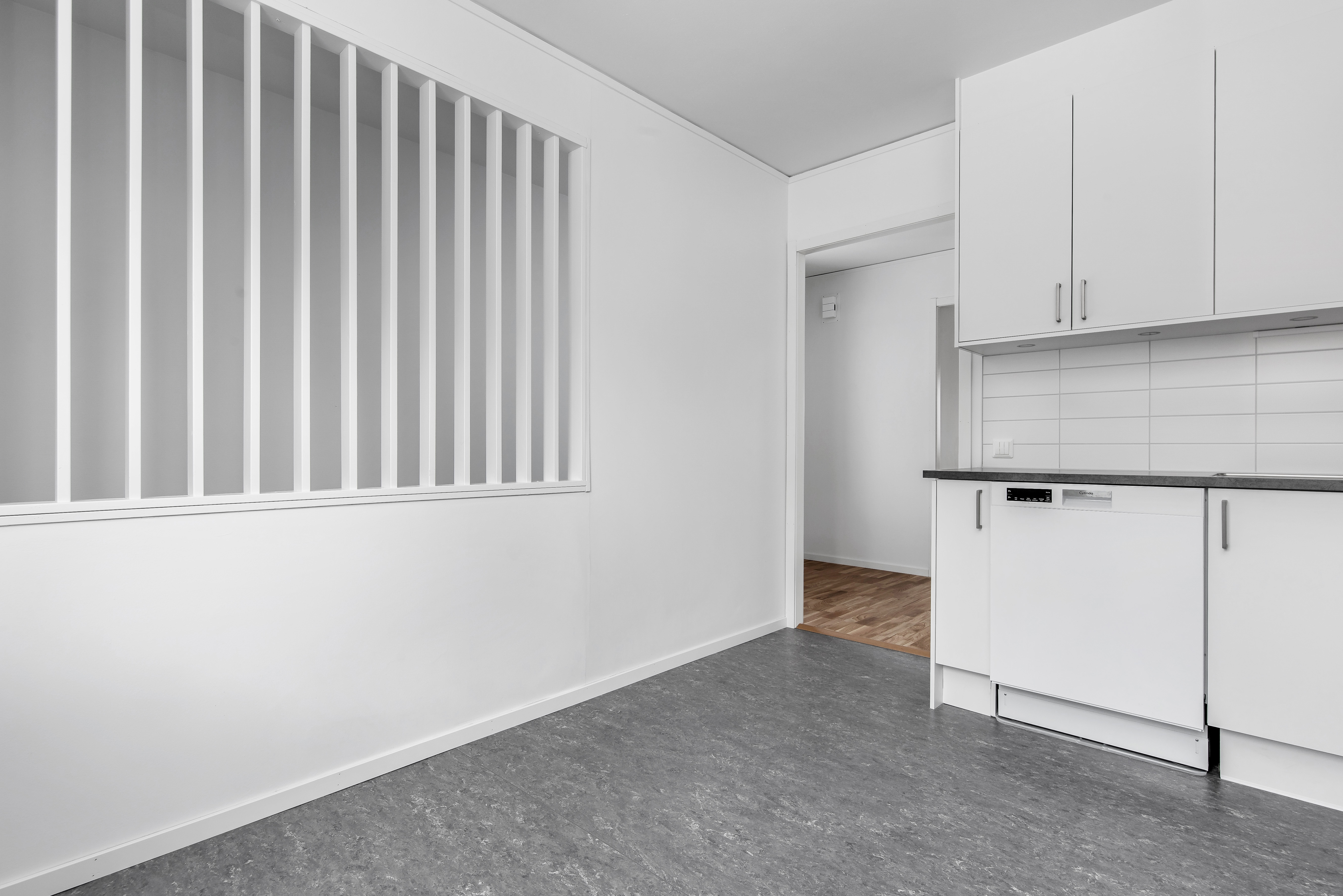 Kök med vitmålade väggar, vitt kakel, vita köksluckor, grå/svart bänkskiva samt grå golvmatta. Maskinell utrustning i form av kombinerad kyl/frys, spis med induktionshäll, inbyggnadsugn och diskmaskin.