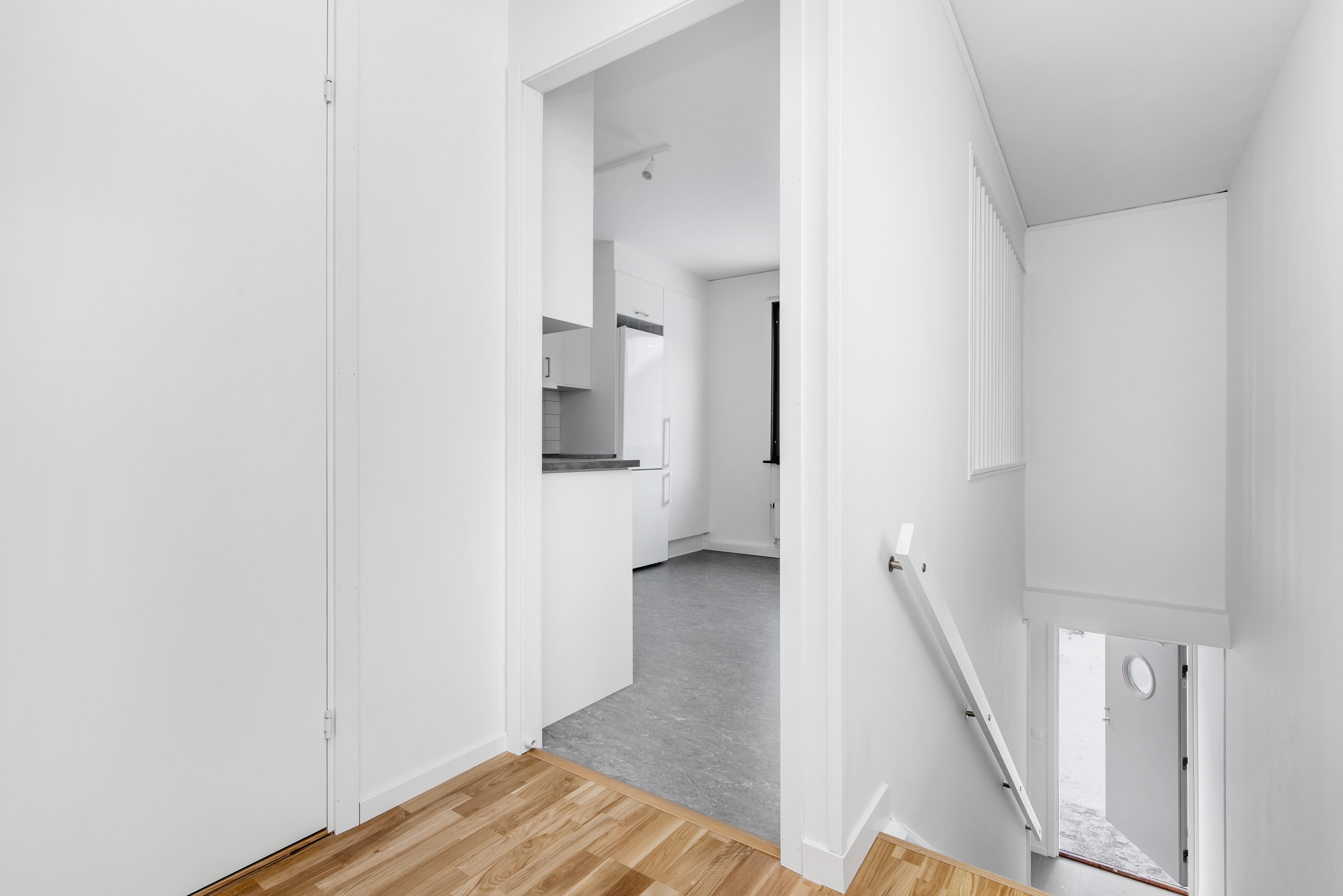 Lägenheten består av: Praktisk hall med egen ingång, klinker vid ytterdörren och plats för klädupphängning samt liten hall på övre plan med plats för mindre möblemang.