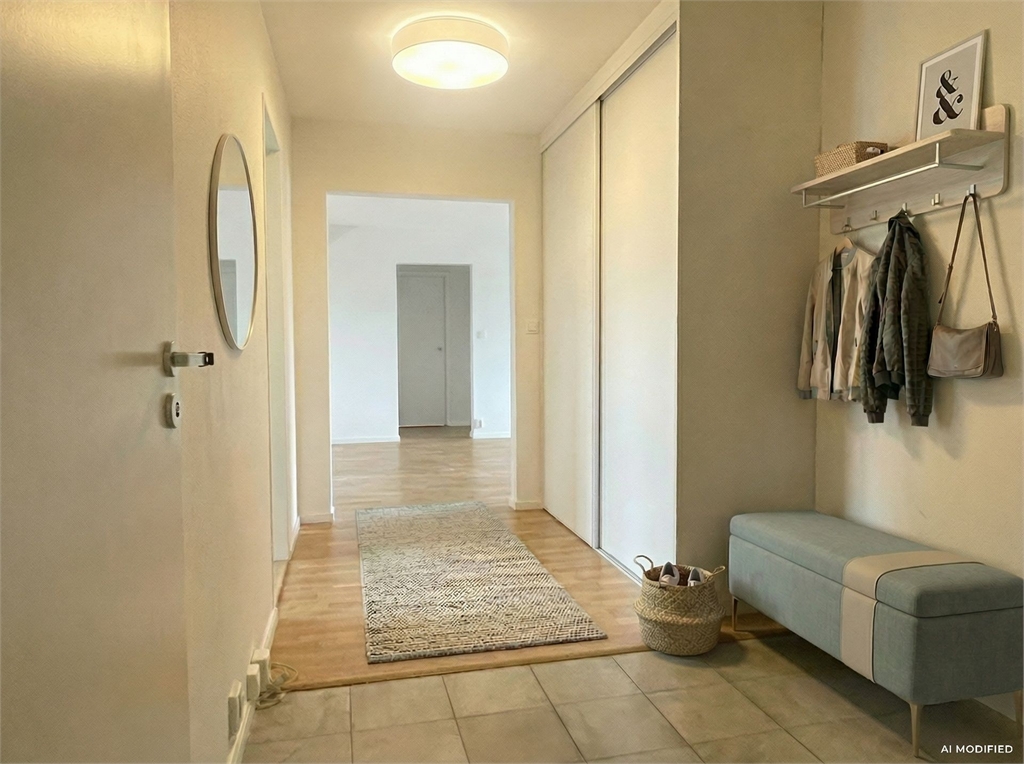 - Välkomnande hall med klinkergolv, skjutdörrsgarderob, parkettgolv och säkerhetsdörr.