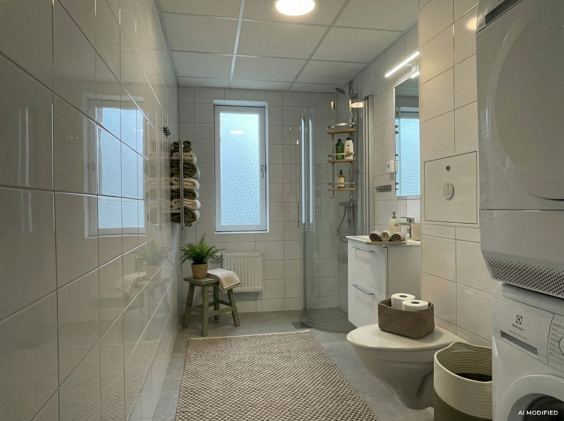 - Det nyrenoverade badrummet är det kaklade väggar och klinkergolv. Badrummet är utrustat med toalettstol, tvättställs kommod, badrumsspegel med belysning, dusch plats med dusch väggar samt tvättmaskin och torktumlare.