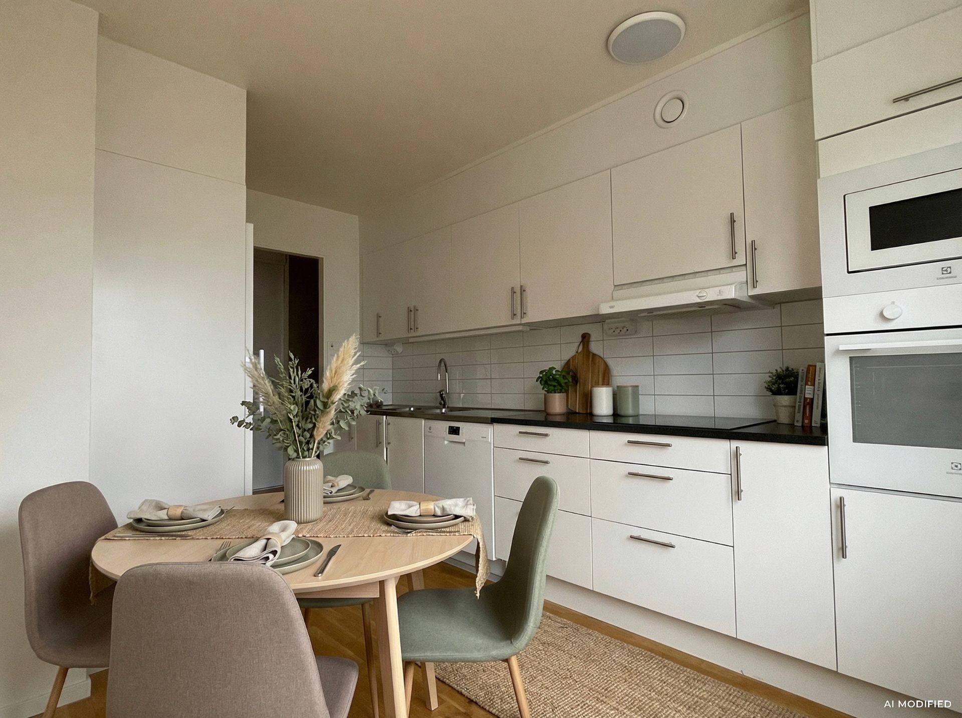 - Kök med vita köksluckor, vitt kakel, parkettgolv, diskmaskin, induktions häll, separat ugn, hel enhet kyl och frys samt inbyggd mikrovågsugn.