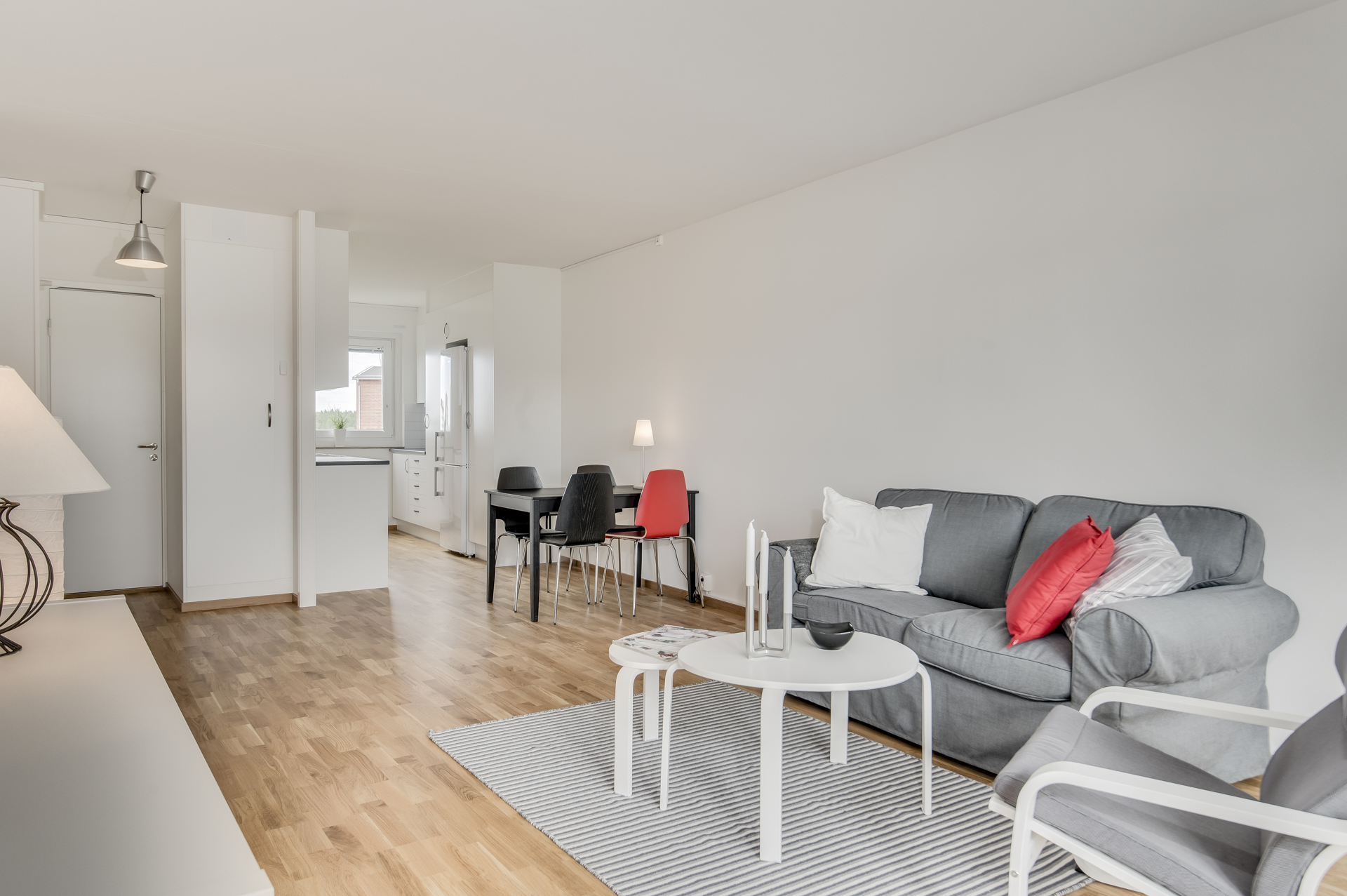 - Vardagsrum med öppen planlösning mot köket och utgång till balkong.