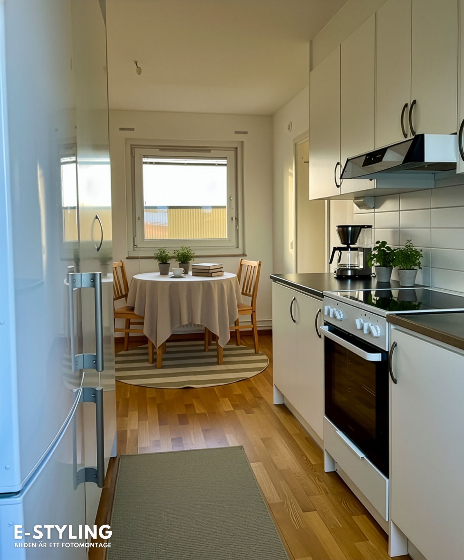 - Ett ljust kök med vitmålade väggar, vita köksluckor och grå bänkskiva. Köket har gott om förvaring och är utrustat med kyl/frys, spis med glaskeramikhäll och varmluftsugn samt är förberett för diskmaskin.