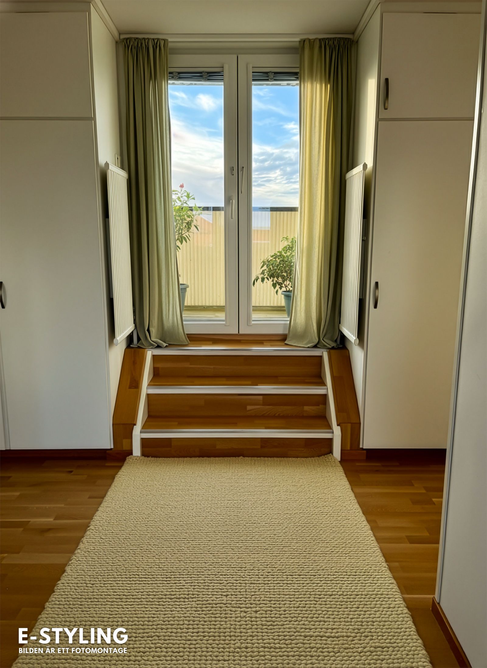 - Badrumet har vitt kakel och ljusgrå klinkers som är utrustat med tvättställ, spegelskåp, wc och elektrisk handdukstork samt skjutbara duschväggar i glas. Badrummet är förberett för tvättmaskin och torktumlare.