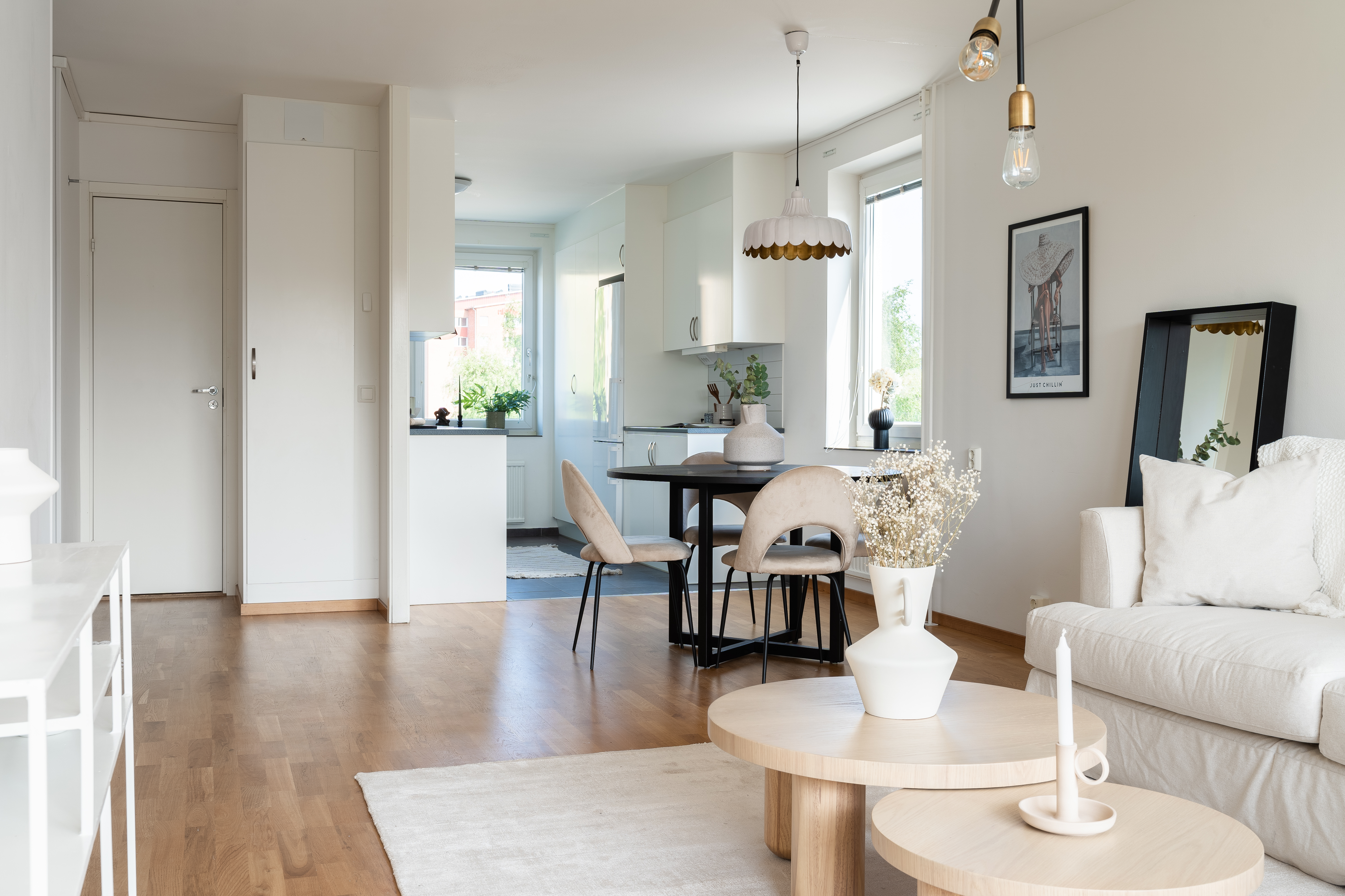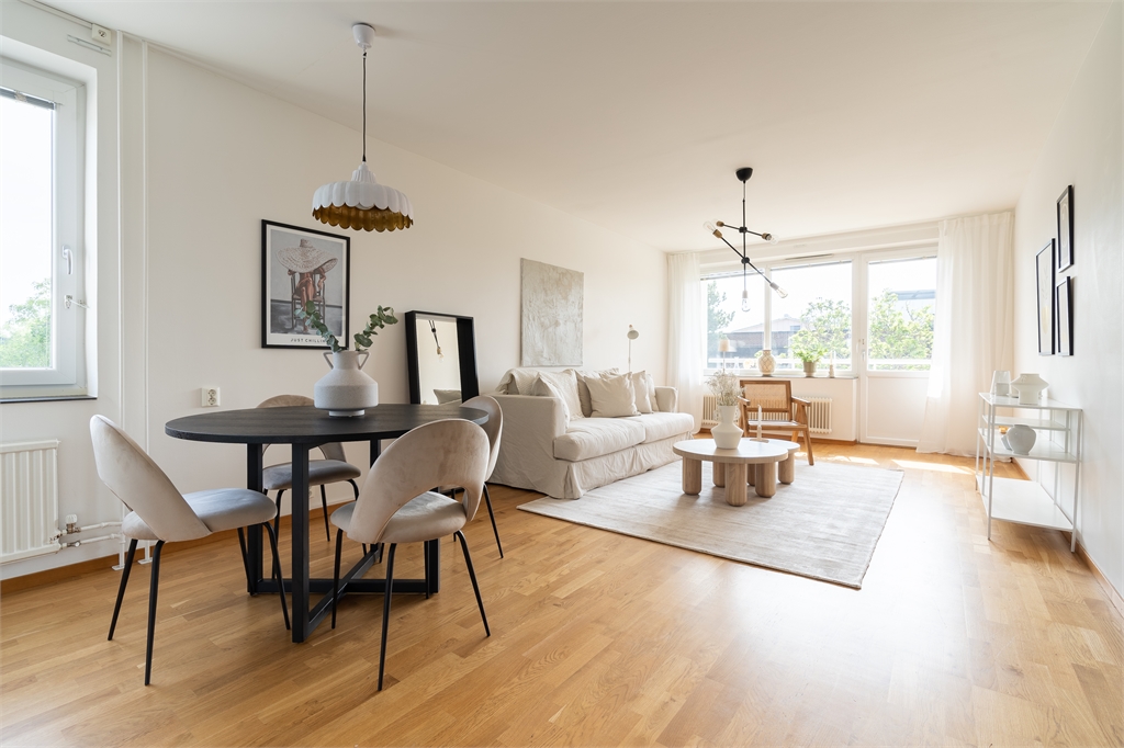 - Lättmöblerat vardagsrum med öppen planlösning mot köket och utgång till balkong.