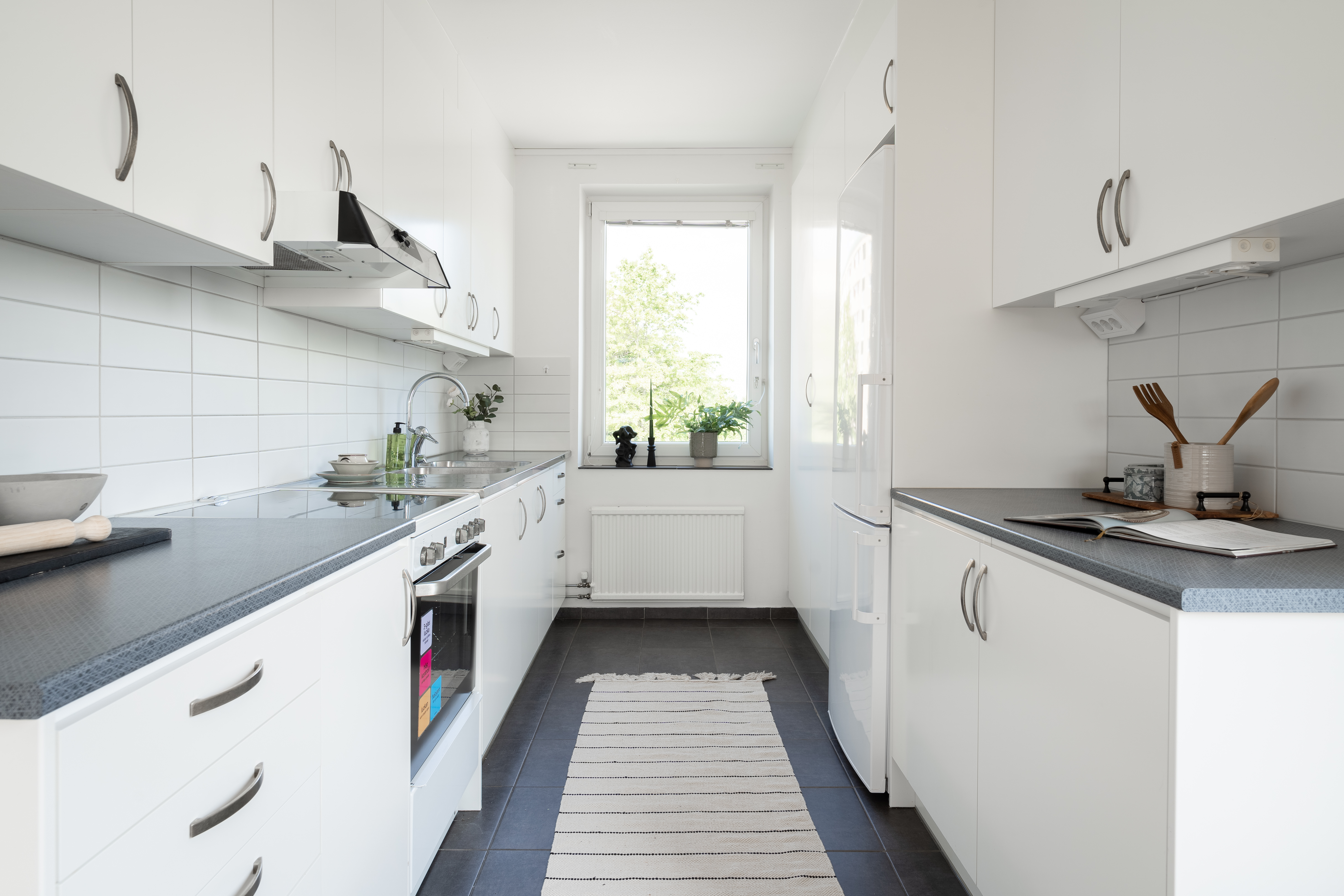 - Ett ljust kök med vitmålade väggar, vita köksluckor, grå bänkskiva och mörkgrå klinkers. Köket har gott om förvaring och är utrustat med kyl/frys, glaskeramikhäll , varmluftsugn och är förberett för diskmaskin.