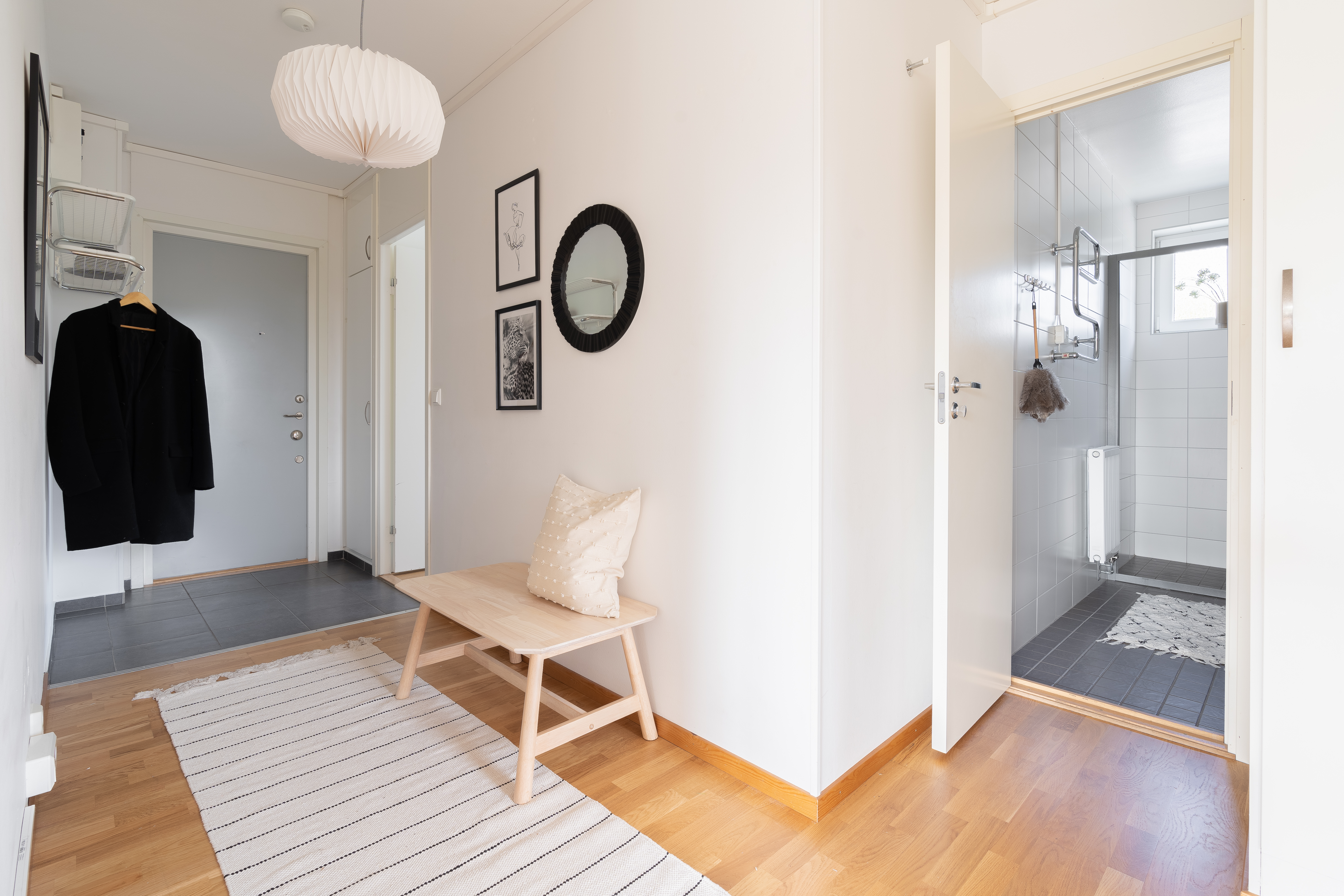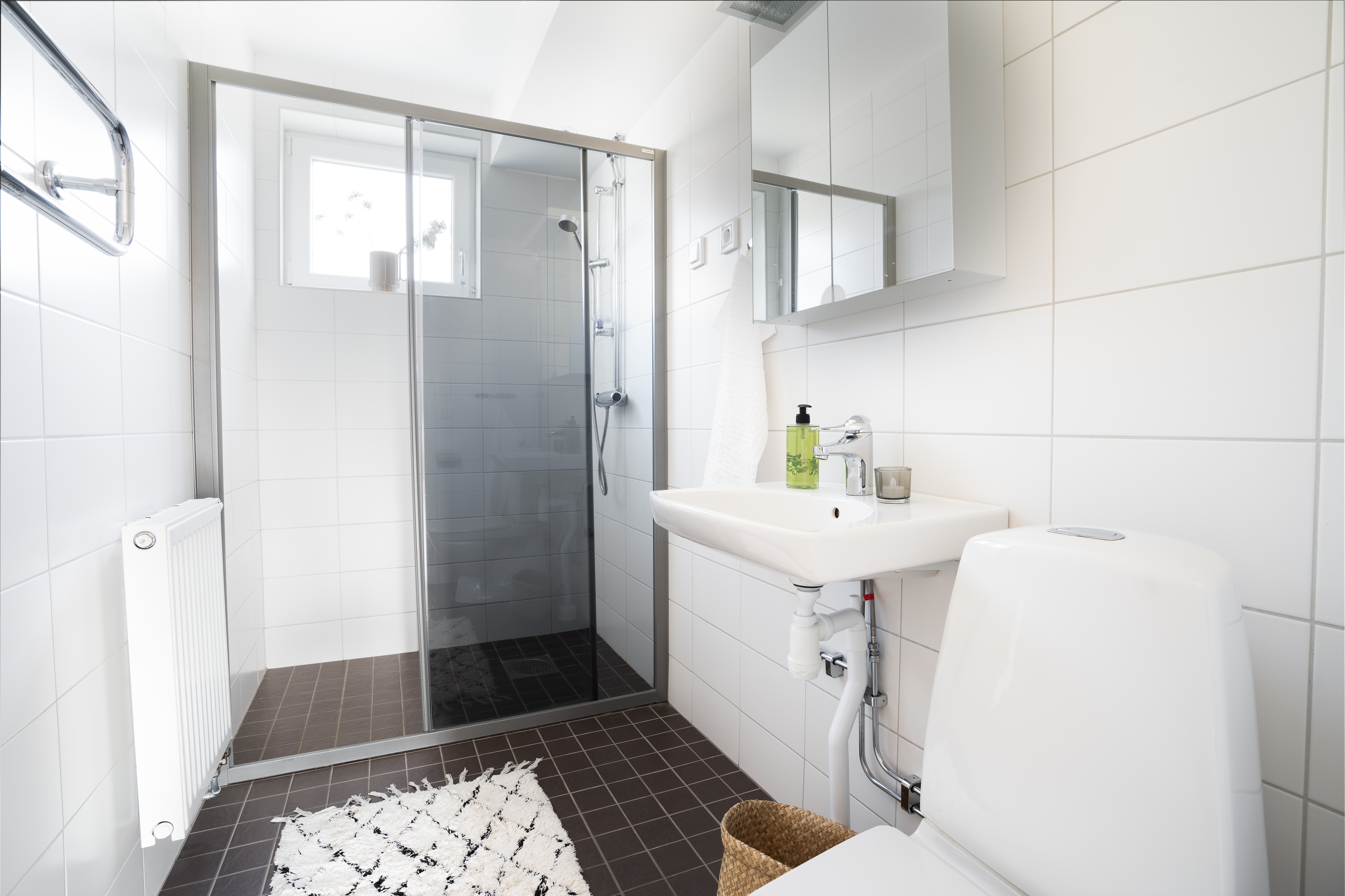 - Ett rymligt badrum med vitt kakel och ljusgrå klinkers som är utrustat med tvättställ, spegelskåp, wc och elektrisk handdukstork samt skjutbara duschväggar i glas. Badrummet är förberett för tvättmaskin och torktumlare.