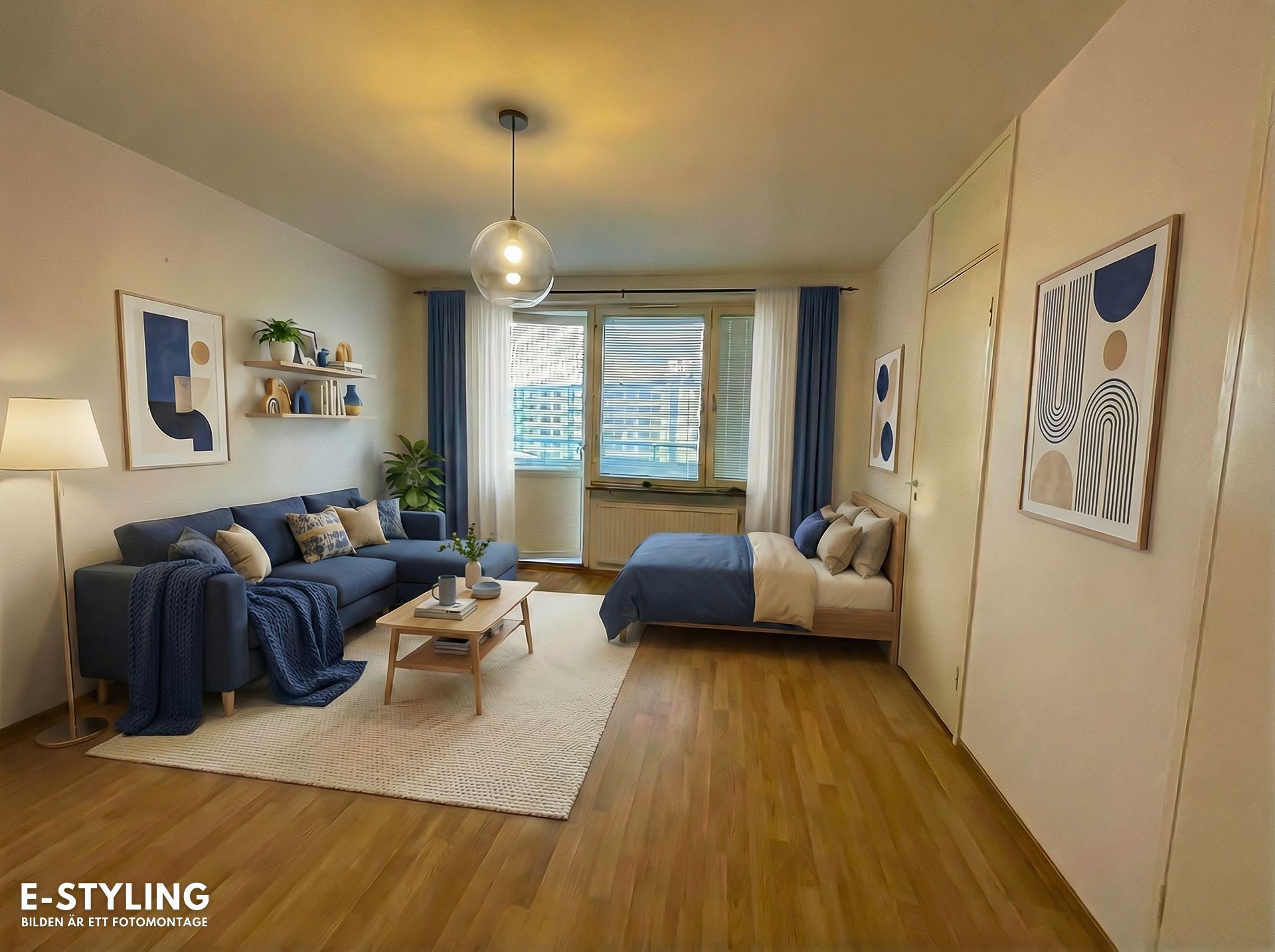 Rymligt allrum med gott om plats för både soffa, soffbord och säng. Den öppna planlösningen skapar en ljus och luftig känsla. Härifrån når du uteplatsen.