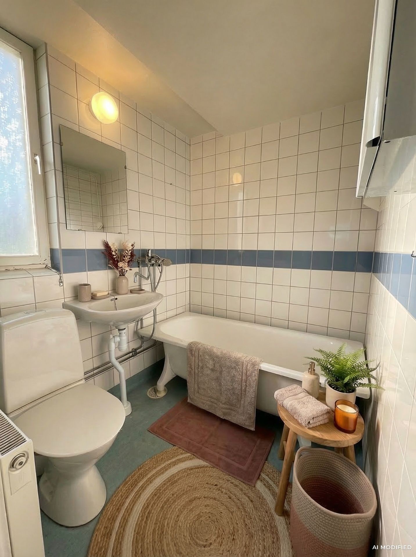 - Badrum med vitt kakel och blå plastmatta. Utrustat med tvättställ, spegelskåp, wc, badkar och det är förberett för tvättmaskin.