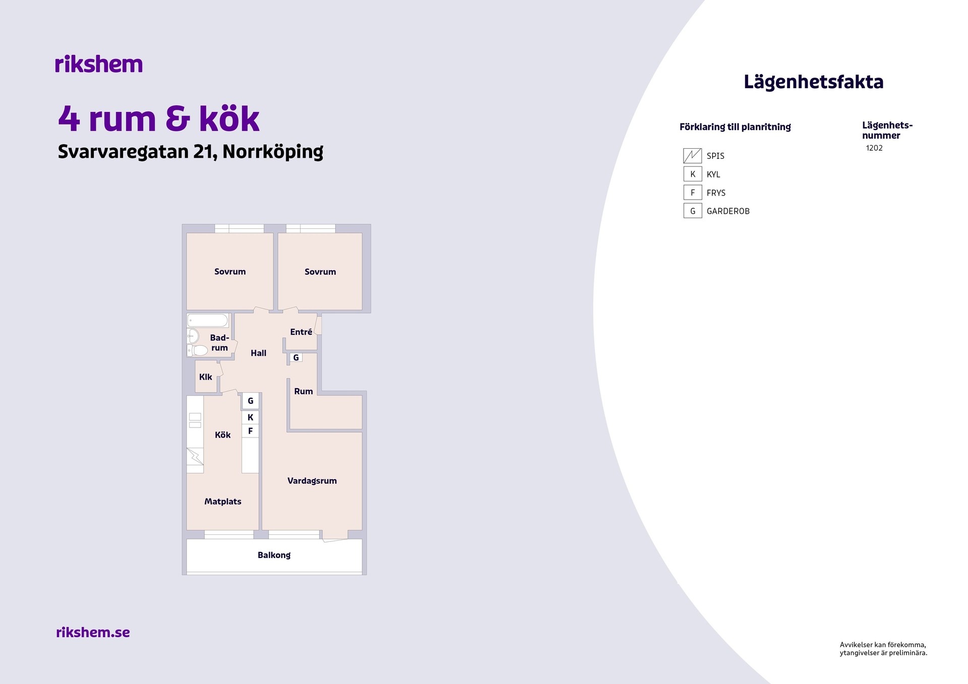 Rikshem reserverar sig mot eventuella fel eller avvikelser som kan förekomma i lägenhetsannonsen eller i planritningen.