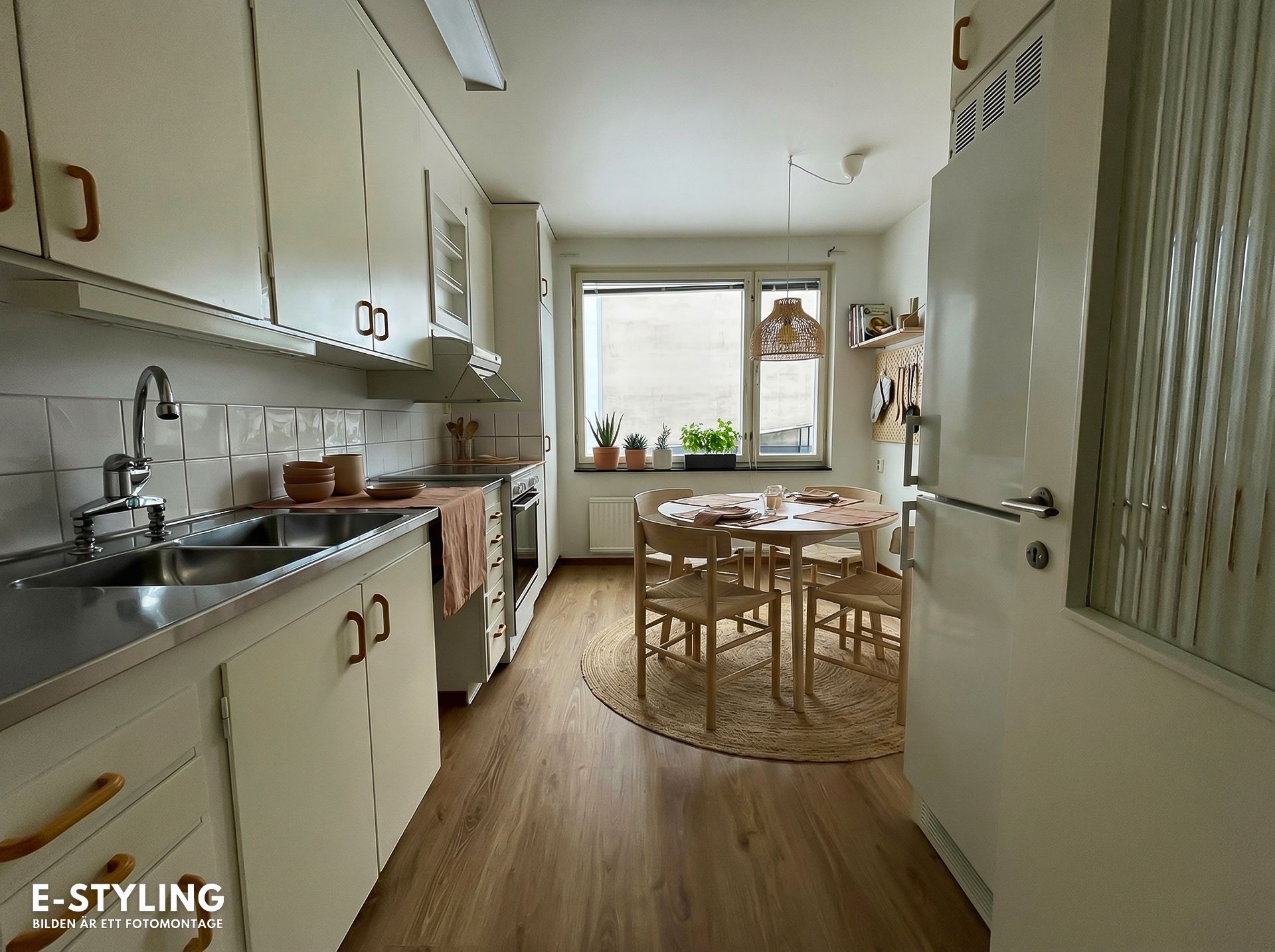 Ljus och fin lägenhet på våning 1. Lägenheten har nya laminatgolv och vitmålade väggar. Hall med mycket garderober och säkerhetsdörr. Kök med vita köksluckor, vitt kakel, kyl/frys, varmluftsugn och spis med glaskeramikhäll. Badrum med plastmatta, vitt kakel och dusch. Rymligt vardagsrum med utgång till den soliga balkongen. Sovrum med garderob.