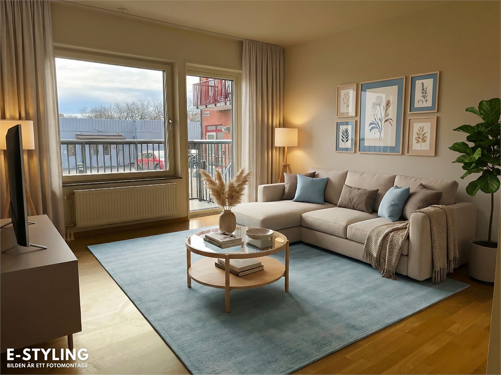 - Vardagsrum med vitmålade väggar och ekparkettgolv samt utgång till balkong.