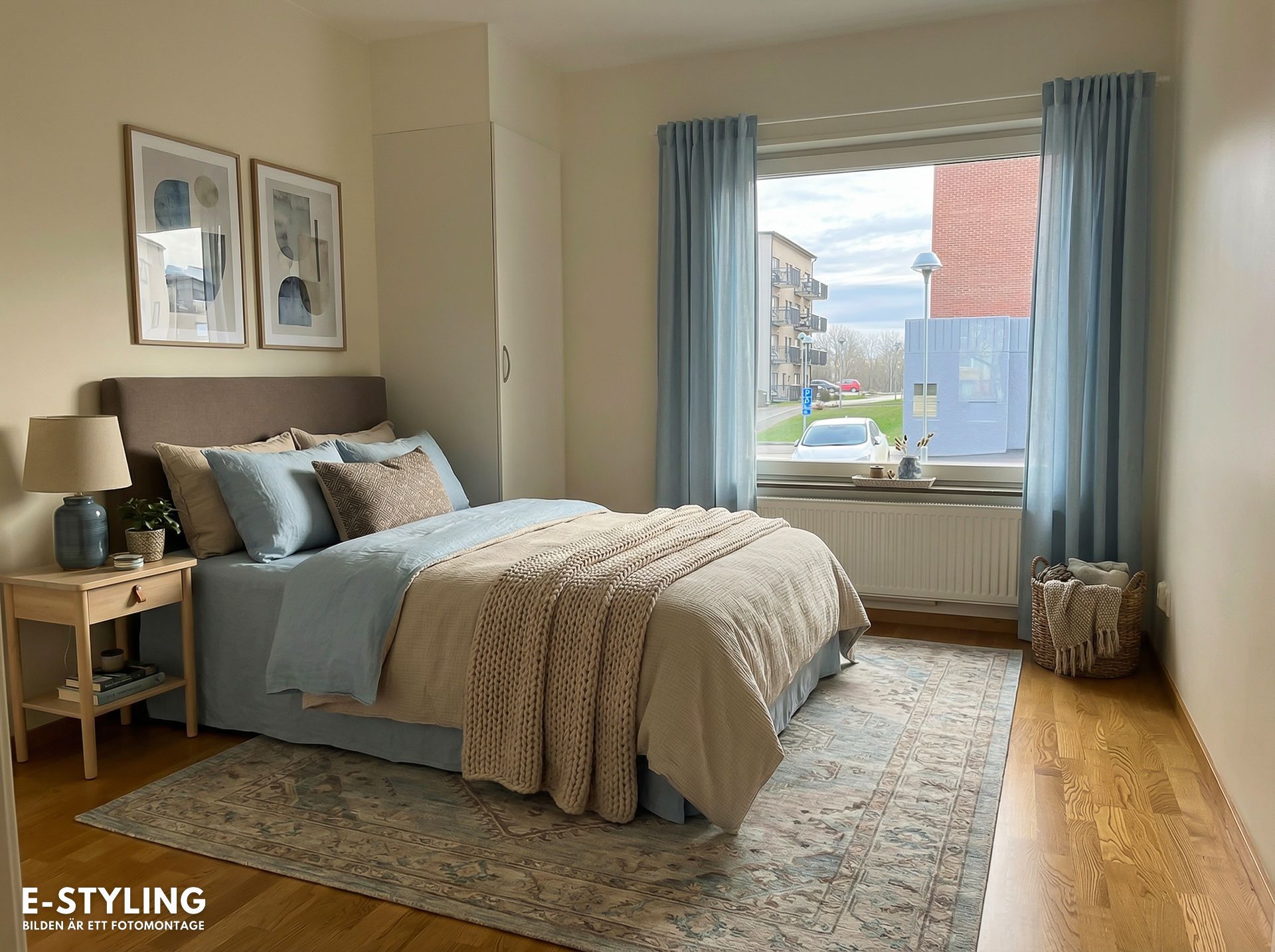 - Sovrum med garderob och plats för säng, sängbord och andra möblemang.
