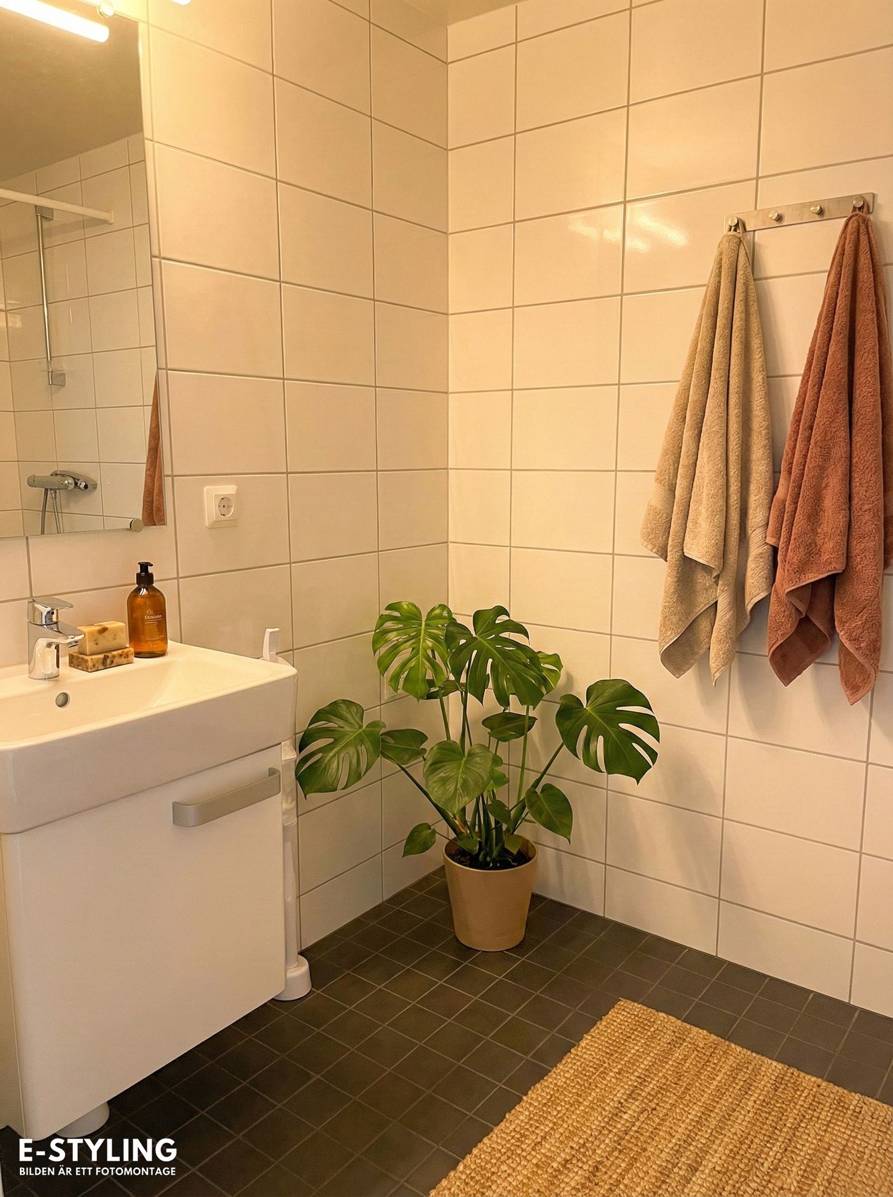 - Rymligt badrum med vitt kakel och grå klinkers. Badrummet är utrustat med tvättställ, spegelskåp, wc, elektrisk handdukstork, golvvärme och förberett för tvättmaskin och torktumlare,