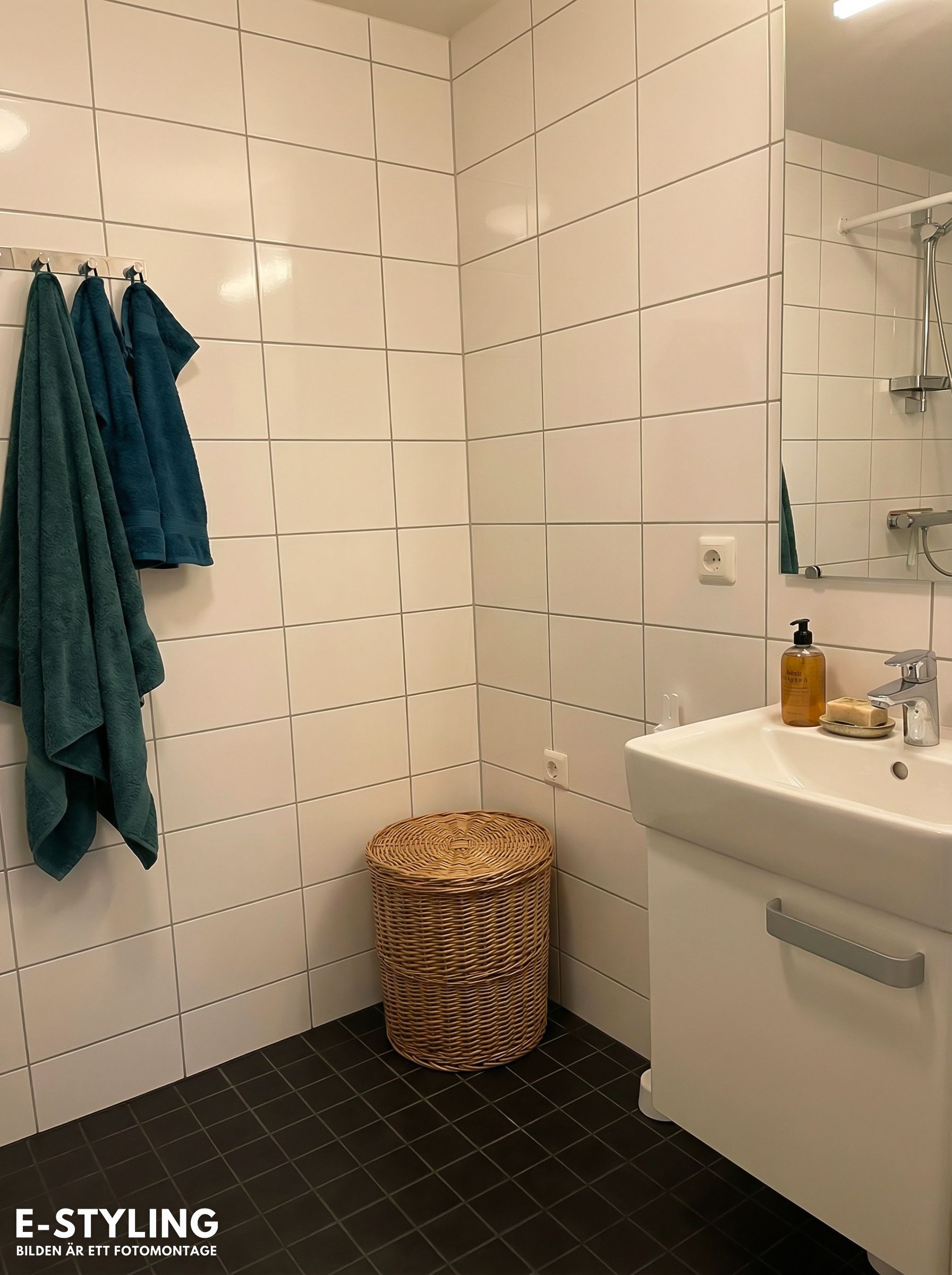 Elegant badrum med vitt kakel, grå klinker, golvvärme, handdukstork och förberett för tvättmaskin.
