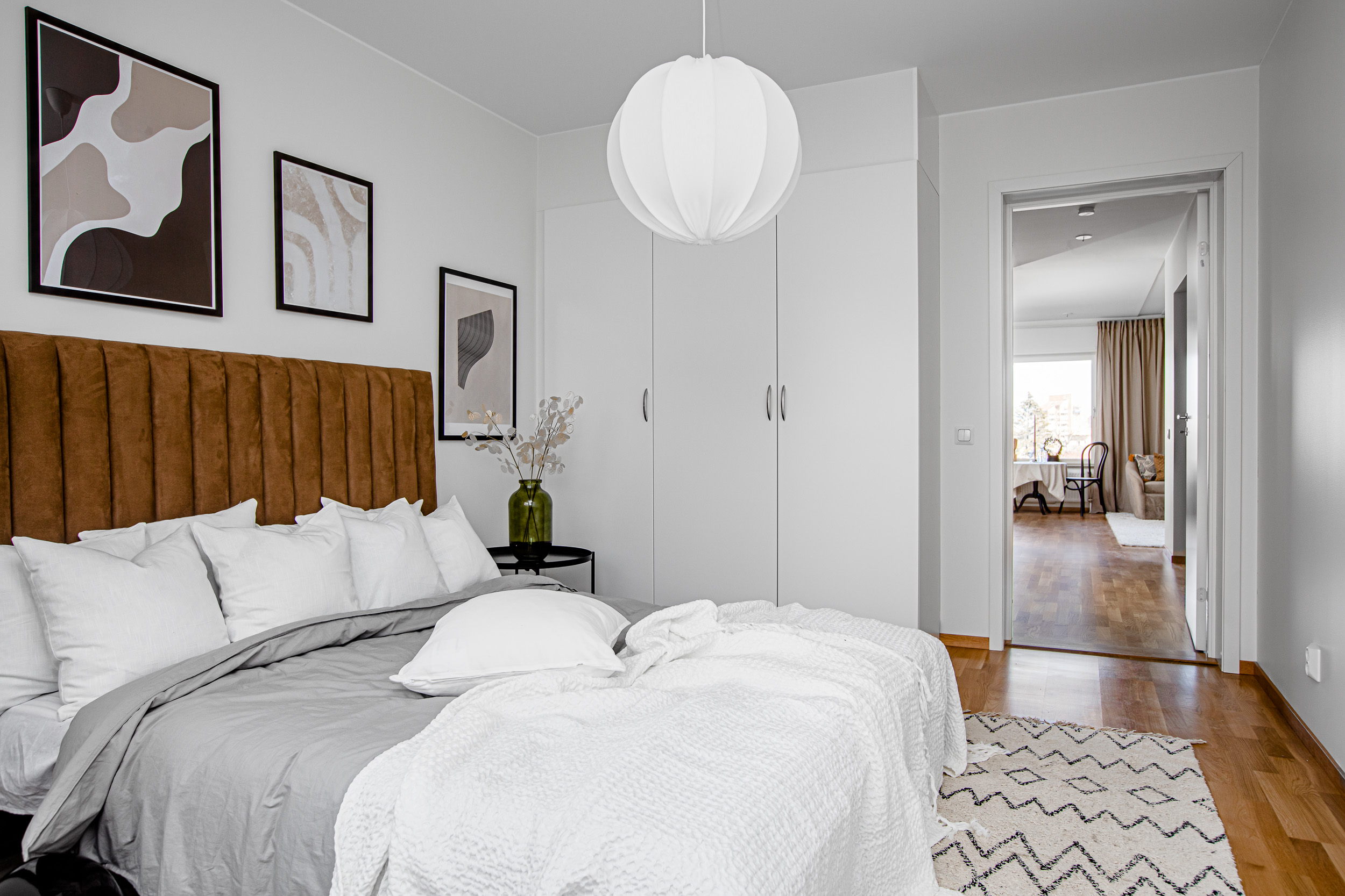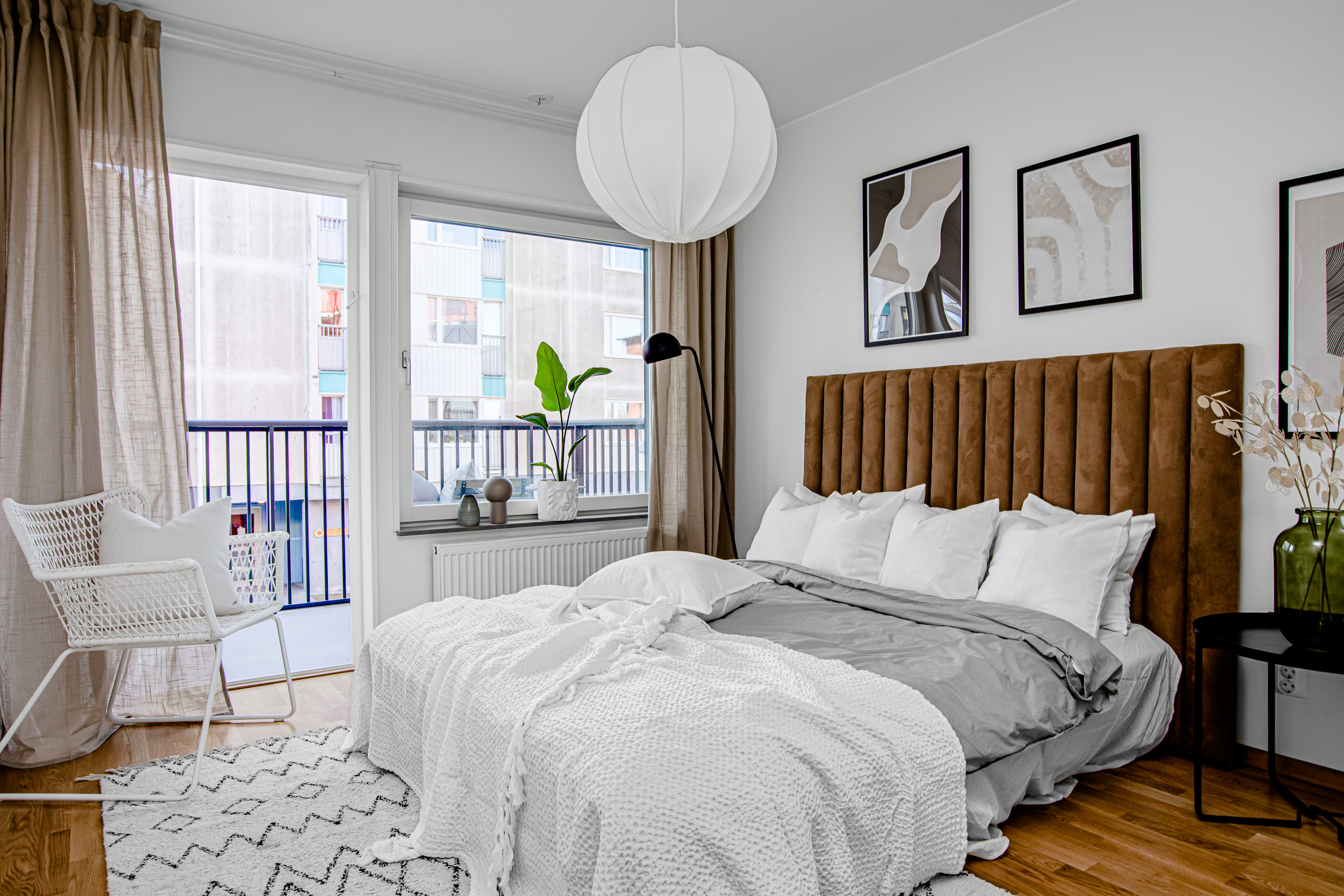 - Sovrum med garderob och plats för säng, sängbord och andra möblemang. Härifrån nås bostadens balkong.