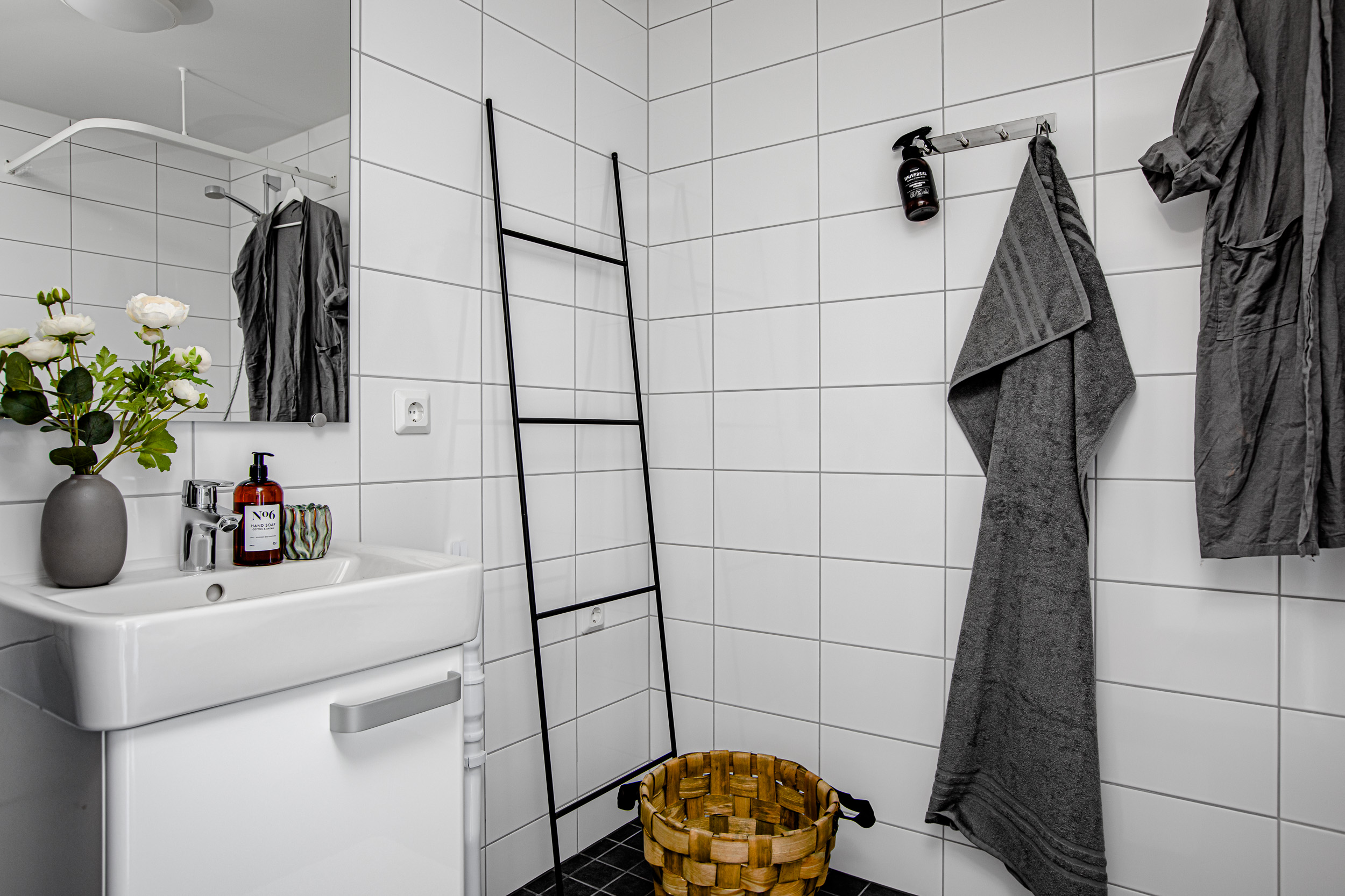 - Rymligt badrum med vitt kakel och grå klinkers. Badrummet är utrustat med tvättställ, spegelskåp, wc, elektrisk handdukstork, golvvärme och tvättmaskin.