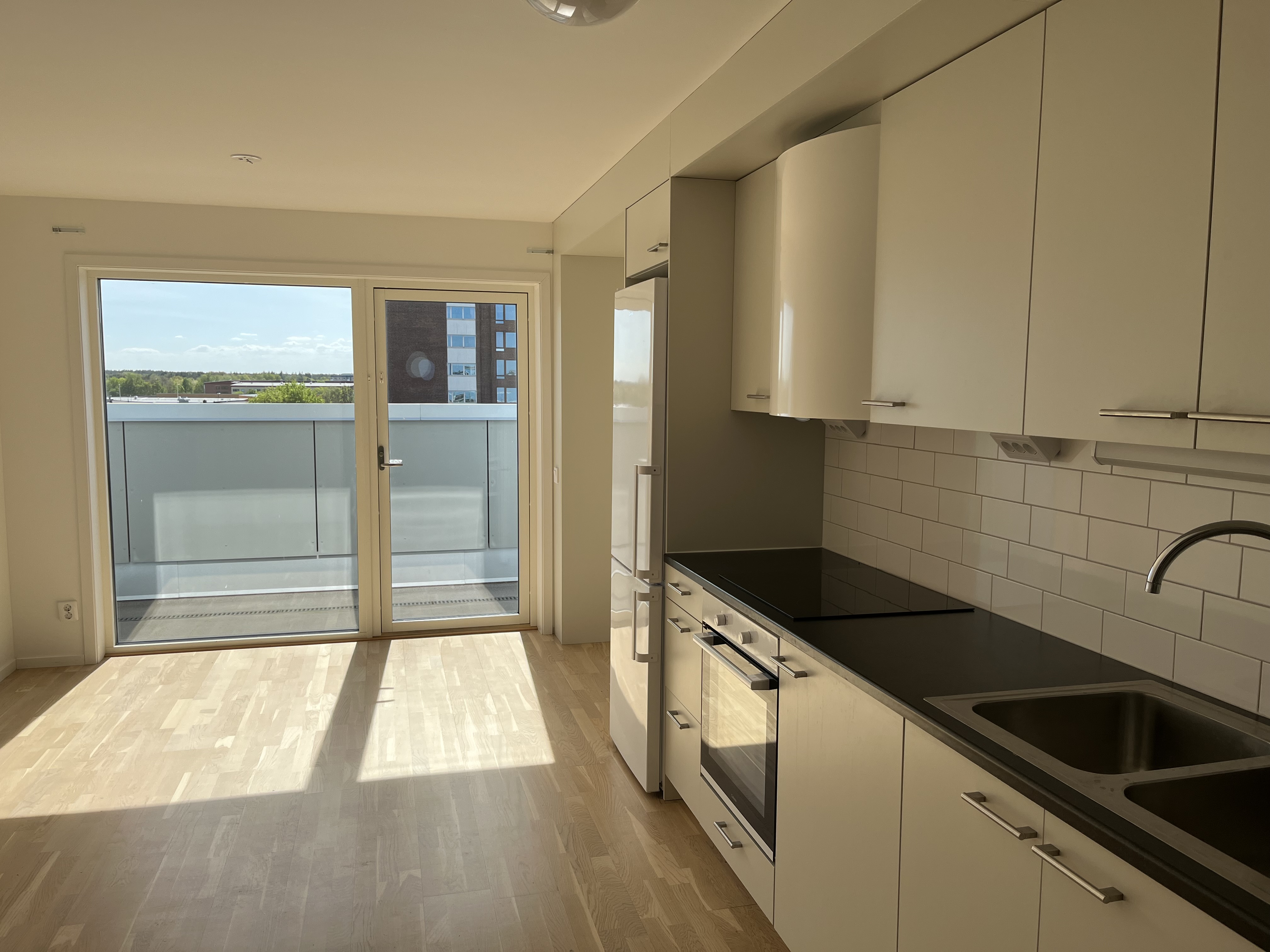 - Kök med öppen planlösning mot vardagsrum. Köket har vita köksluckor och mörkgrå bänkskiva och är utrustat med kyl/frys, inbyggnadsugn och induktionshäll. Här finns gott om förvaring och möjlighet att installera diskmaskin.