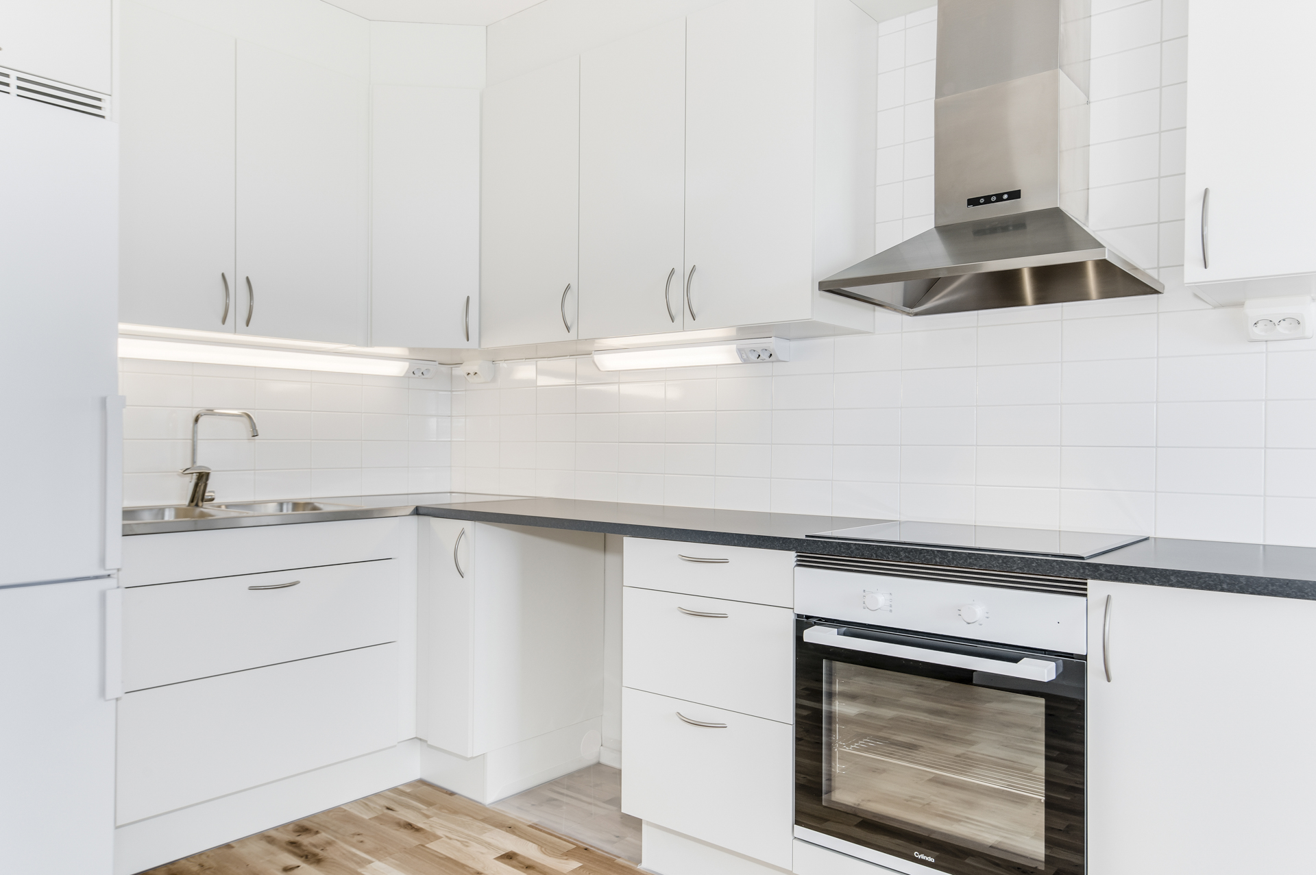 Kök med vita köksluckor och grå bänkskiva utrustat med kyl/frys, ugn och glaskeramikhäll. Köket har gott om förvaring och är förberett för diskmaskin.