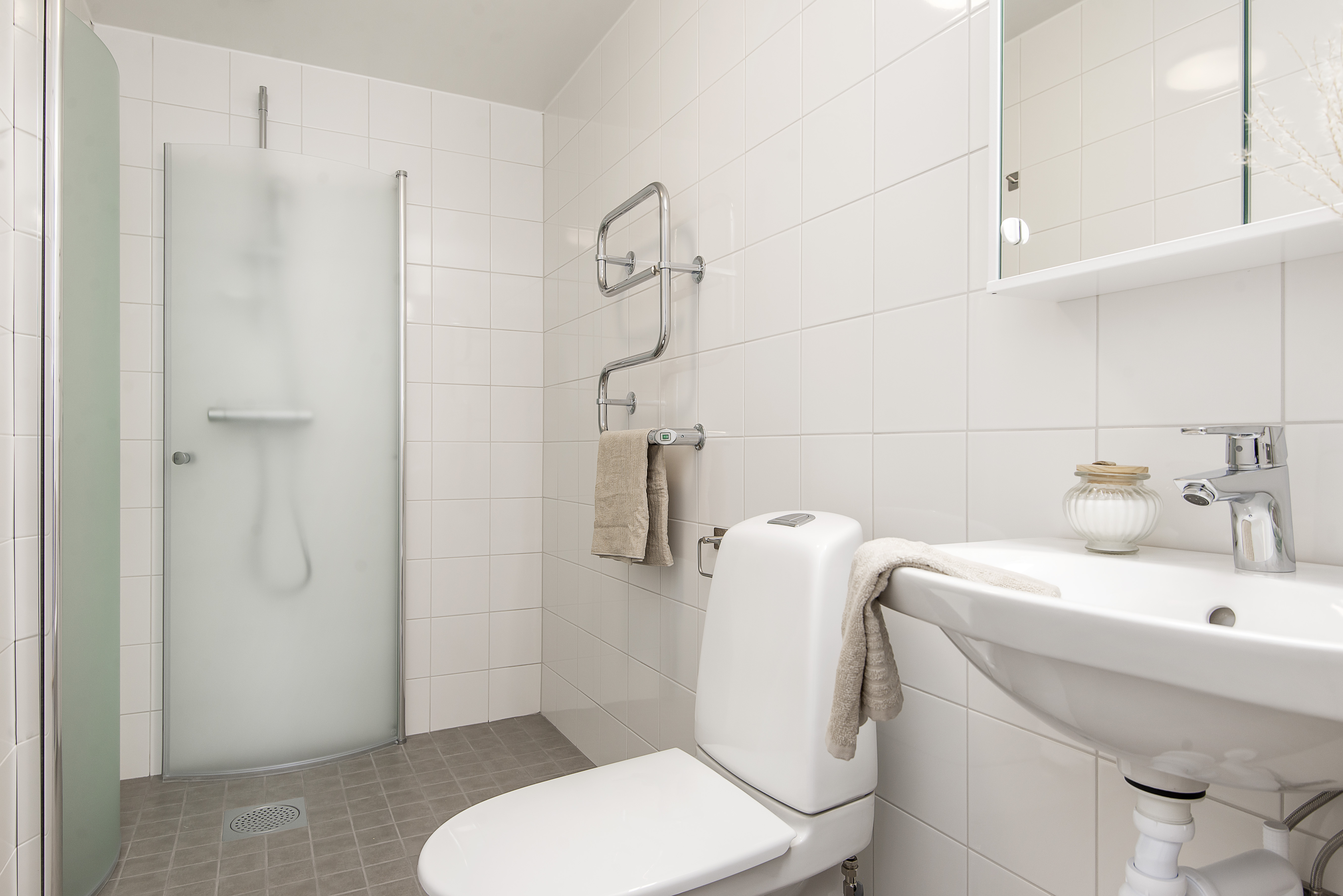 Badrum med vitt kakel och grå klinkers och utrustat med tvättställ, spegelskåp, wc och vikbara duschväggar i frostat glas. Handdukstork och elektrisk golvvärme finns installerat.