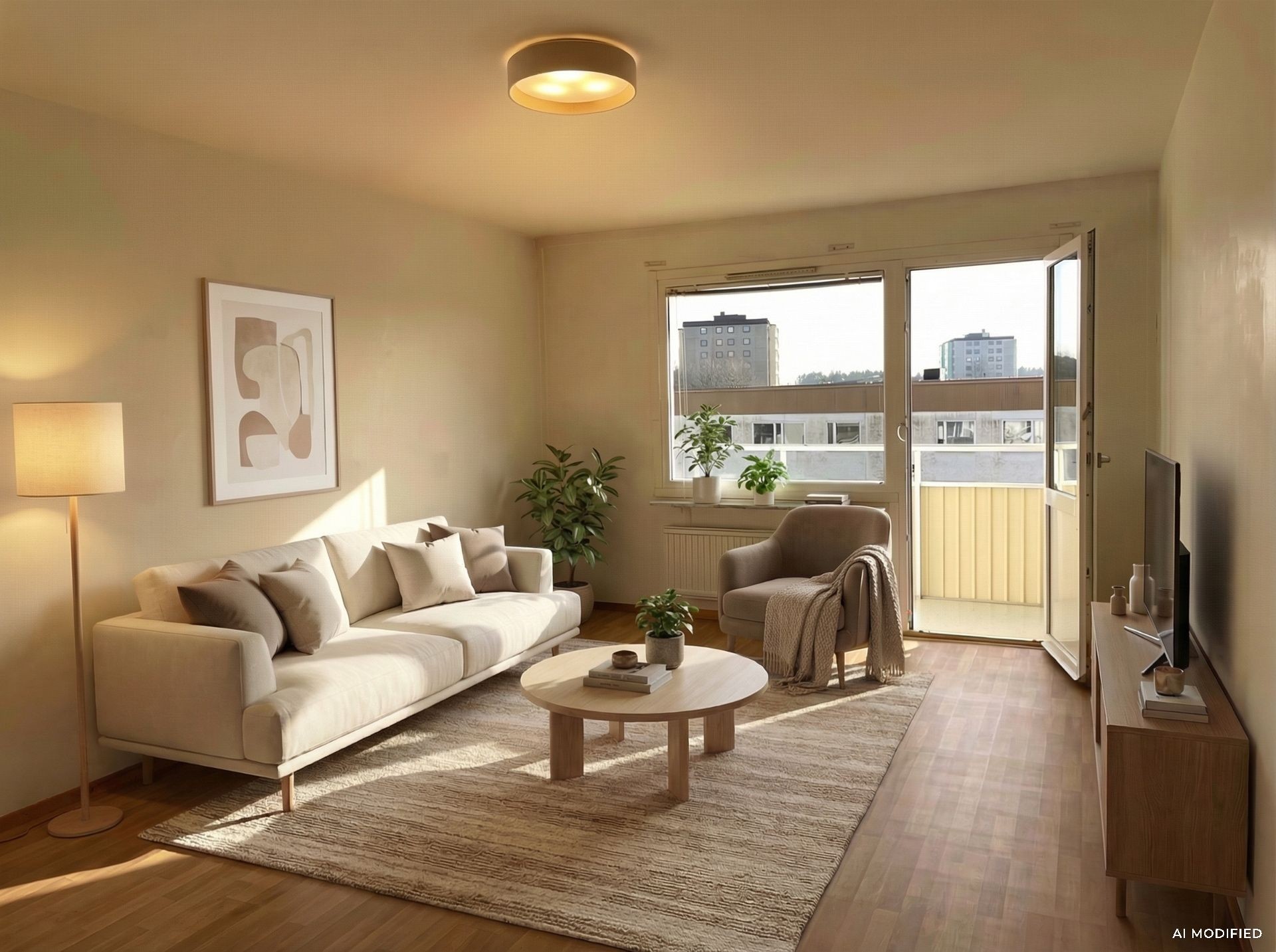 Det rymliga vardagsrummet har utgång till en härlig balkong mot den gröna innergården. Perfekt för avkoppling och en kaffe i solen.
